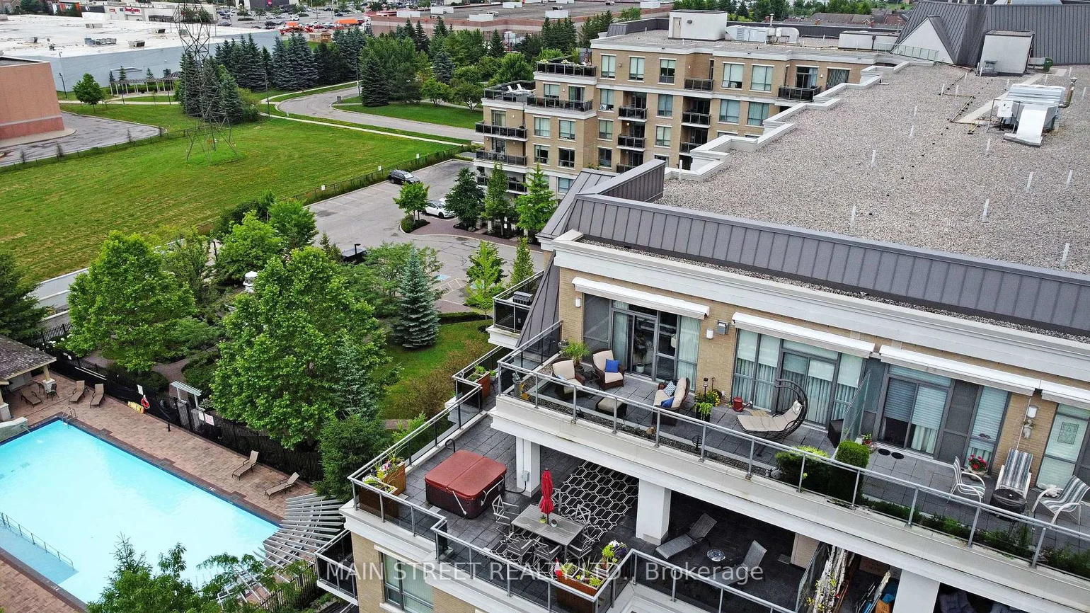 Top-of-the-world living in one of Aurora's most prestigious condominium residences. This stunning penthouse offers breathtaking sunset views from an expansive 271 sq. ft. semi-private terrace a truly one-of-a-kind. Enjoy your morning coffee overlooking the city of Aurora, or unwind in the evening while taking in spectacular sunsets. The terrace also features a convenient awning for added shade and comfort on sunny days. Inside, the thoughtfully designed open-concept layout is perfect for both everyday living and effortless entertaining. The modern kitchen features stainless steel appliances, granite countertops, double oven, wood flooring and ample space for hosting family and friends. Soaring 10-foot ceilings, and floor-to-ceiling windows fill the home with an abundance of natural light throughout. The unit features three walk-outs from the bedrooms and living area, seamlessly connecting indoor and outdoor living spaces. A versatile den offers flexibility as either a home office or formal dining room. Elegant finishes include crown moulding in the living and dining areas, beautiful drapery throughout, and engineered flooring across the entire unit, creating a sophisticated and cohesive feel.