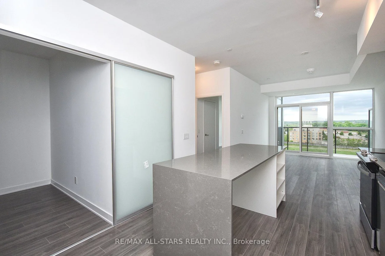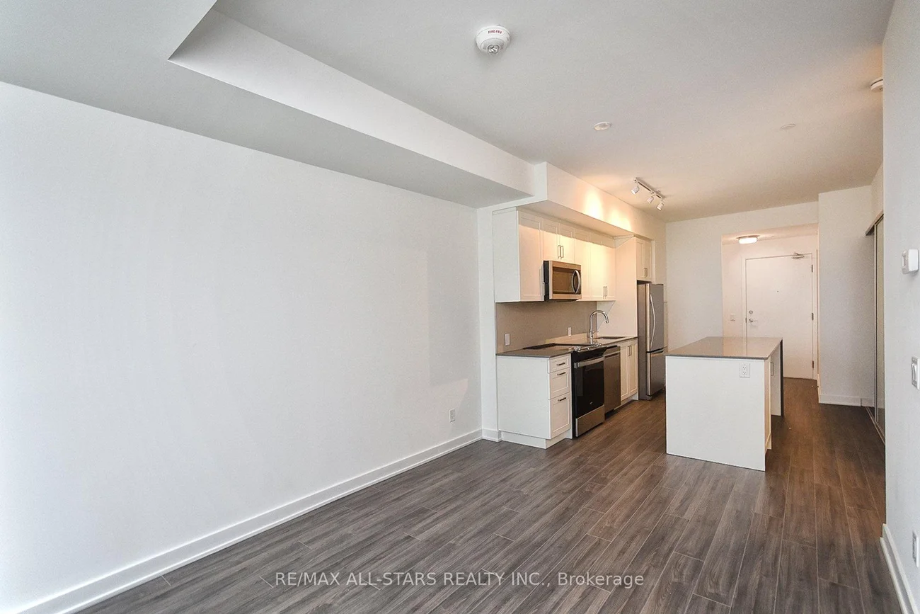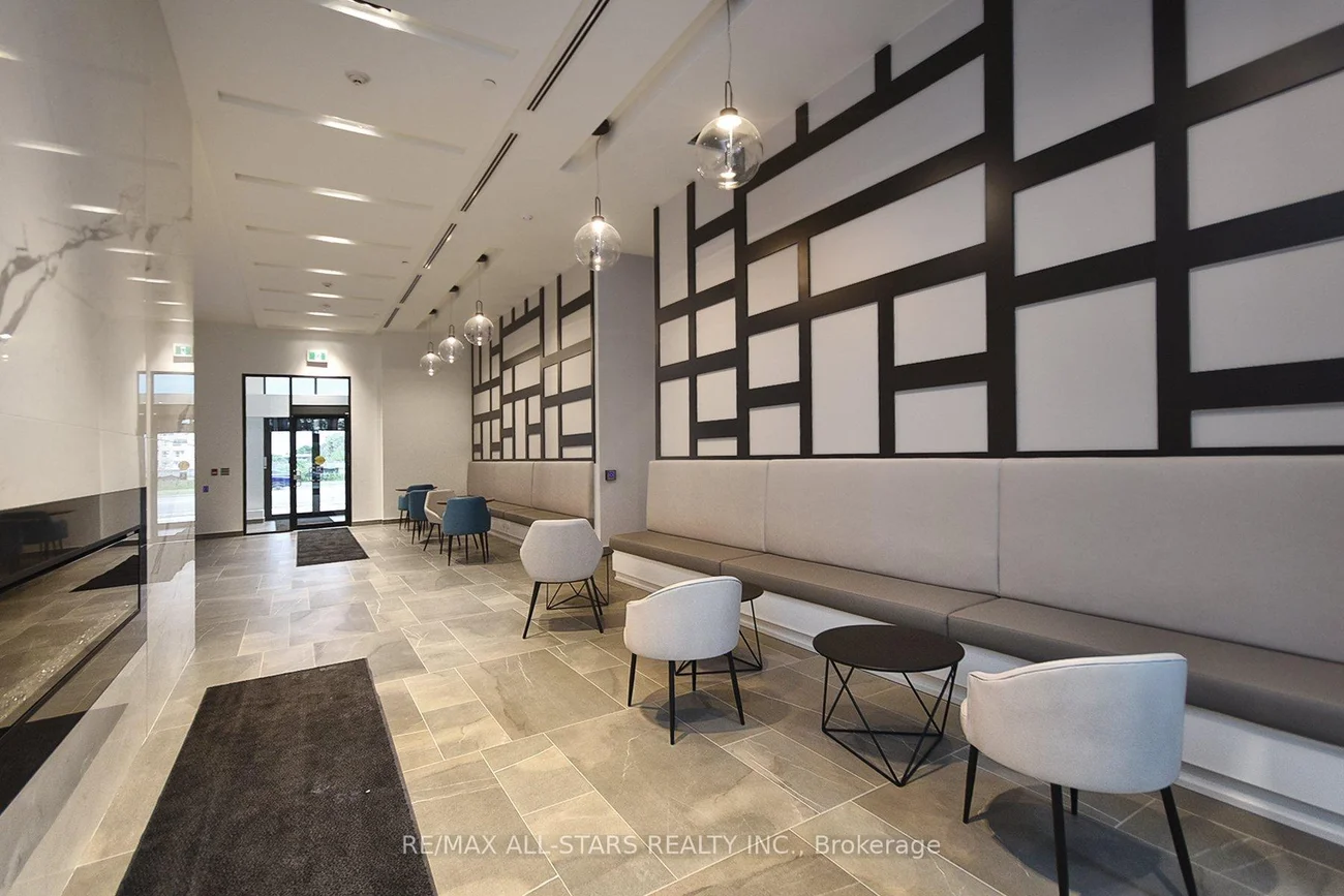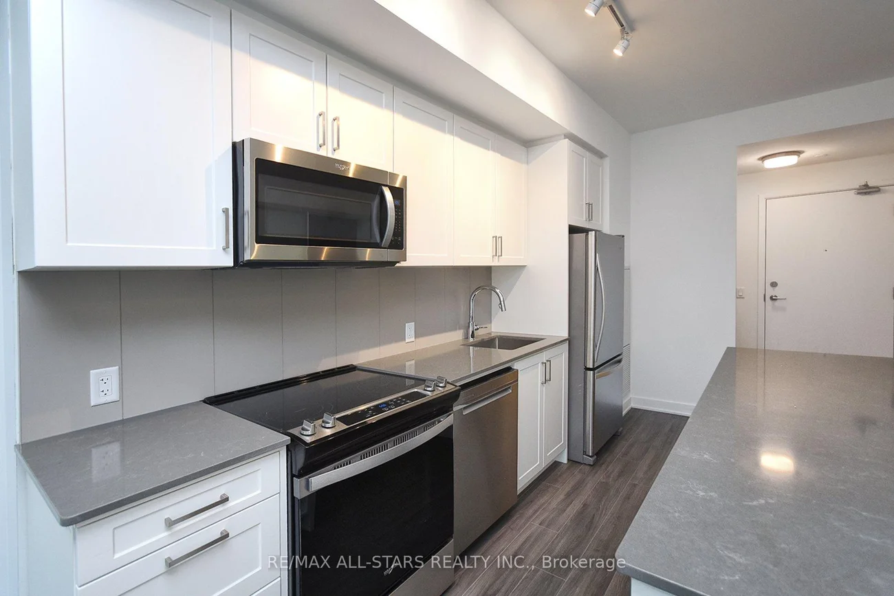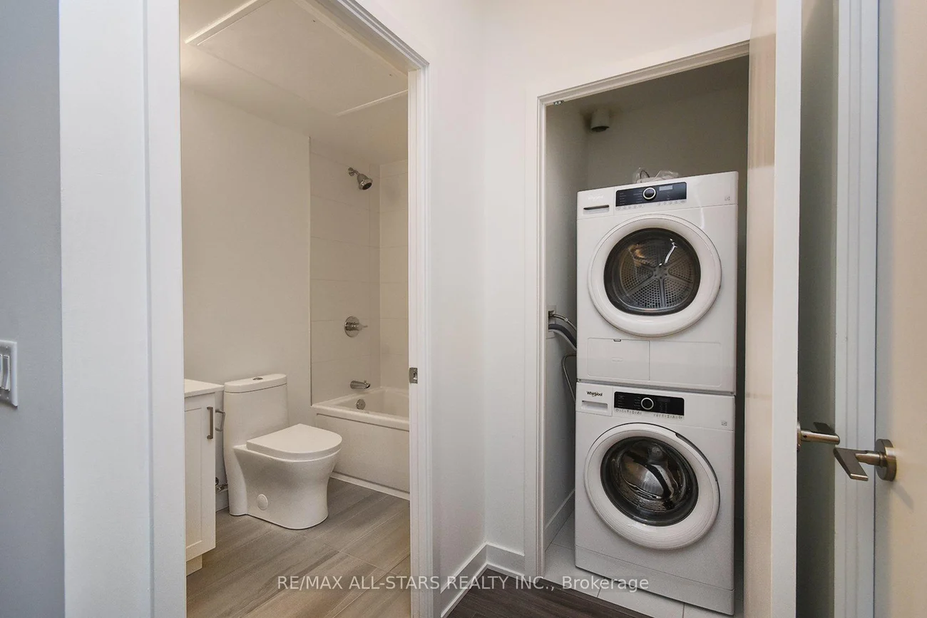 Bright and Spacious Unit, featuring a functional 1 bedroom plus oversized Den layout. The primary bedroom includes a walk-in closet, while the large Den offers its own closet and sliding doors, making it ideal for a home office, guest room, or additional living space! Enjoy open-concept living with smooth 9-foot ceilings that enhance the airy feel throughout. The modern kitchen is equipped with quartz countertops, stylish backsplash, center Island, and sleek cabinetry with ample storage. Stainless steel appliances include Fridge, Stove, Built-in Dishwasher, and Over-the-Range Microwave with Hood fan. This unit also features stacked washer & dryer, installed light fixtures, and window coverings for added convenience. Includes one heated underground parking space and one locker. Residents enjoy premium building amenities such as Rooftop Terrace with Lounge and BBQ area, Party room, fully equipped fitness center, Concierge service, and Visitor parking, all within a secure and well-maintained building. Conveniently located just minutes from schools, grocery stores, and the GO Station, offering easy access to daily amenities and transit.