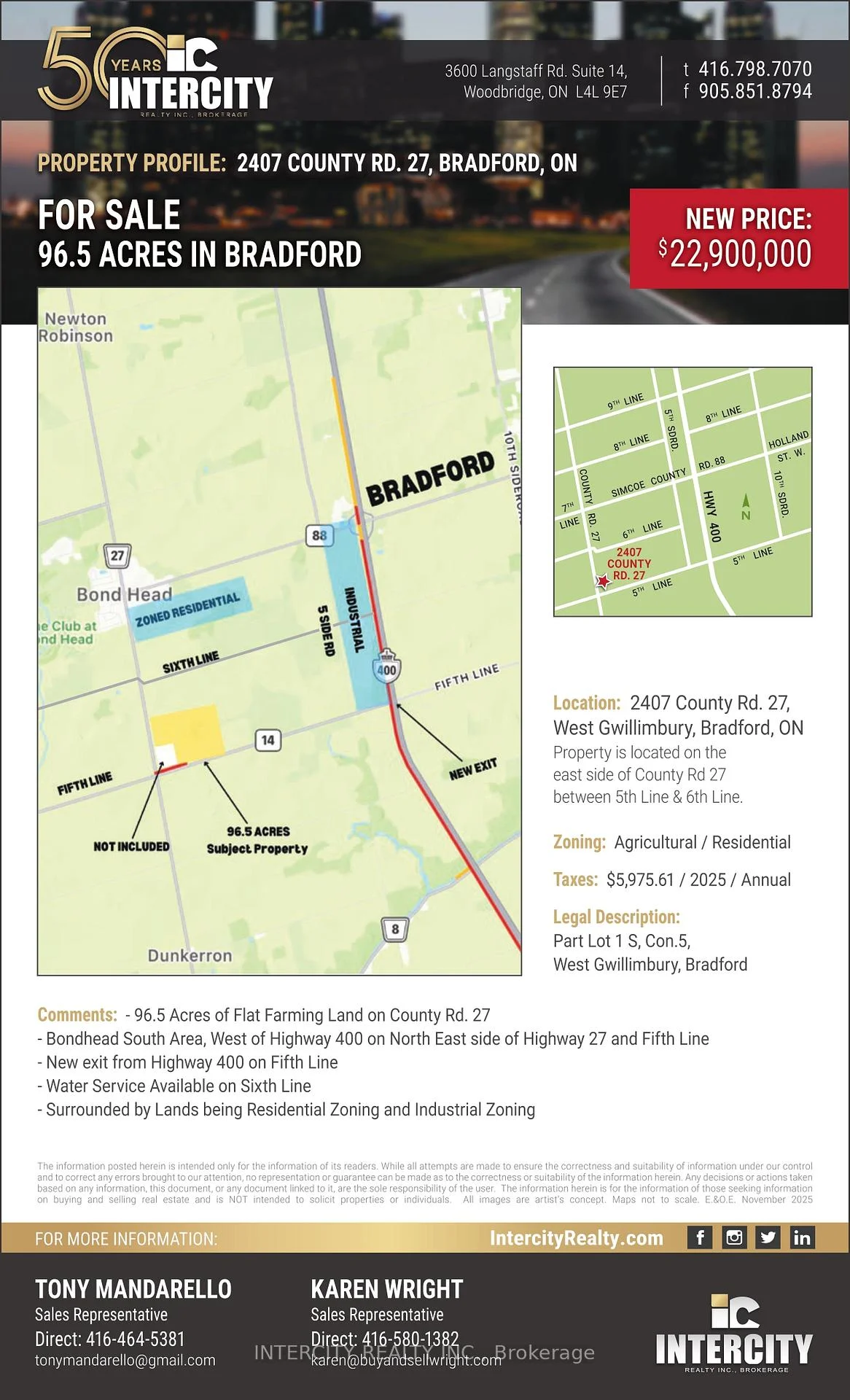The subject property 96.50 Acres, is situated in a strategic location, at the North-East corner of Highway 27 and 5th Line. The subject lands are currently zoned Agricultural (A), White belt lands. The lands just to the north are part of a major mixed-use residential development. There is a residential community currently being developed just North West of Highway 27 from these subject lands with prominent builders commencing development/ sales and marketing. Seconds away to the east side of the subject lands is the newly opened 5th Line bypass which connects to Highway 400, as well as employment lands that have just been approved by the Town of Bradford. With the potential for diverse land uses NOTE: VTB Available (Tbn)