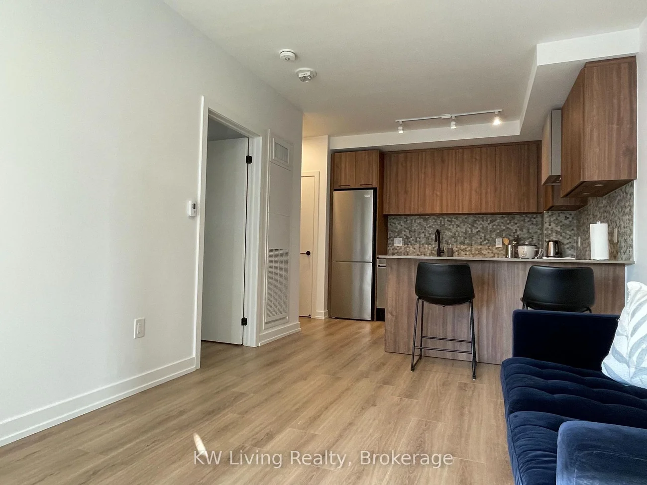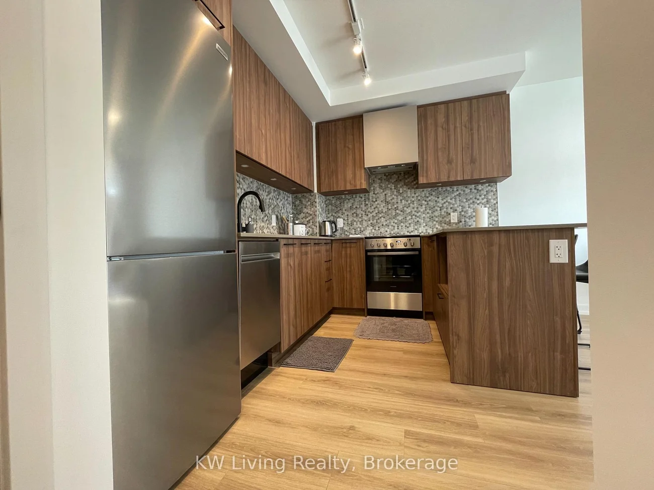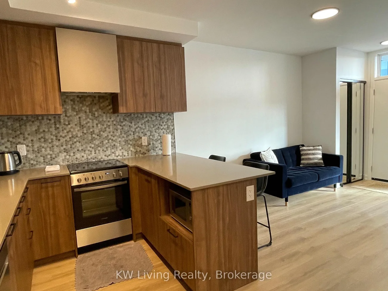 Gorgeous ground-floor townhouse in the highly sought-after Daniels Mount Pleasant Village, featuring a private entrance and terrace. Enjoy main-floor living, ideal for convenience and accessibility. This bright, well-lit, open-concept unit offers 9-ft ceilings, a modern kitchen with stainless steel applianaces, quartz countertops, mosaic tile backsplash, and under-cabinet lighting. Stacked front-loading washer and dryer. The spacious bedroom includes a walk-in closet and walk-out to the terrace. Includes two island stools and window coverings. Located within walking distance to Mount Pleasant Go Station, shopping, and restaurants. Heating, high speed internet, 1 parking space and 1 locker included.