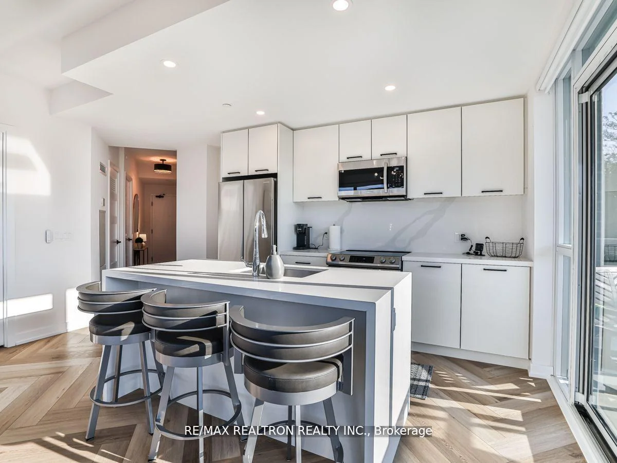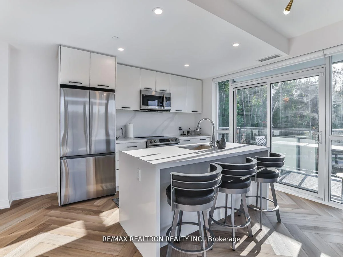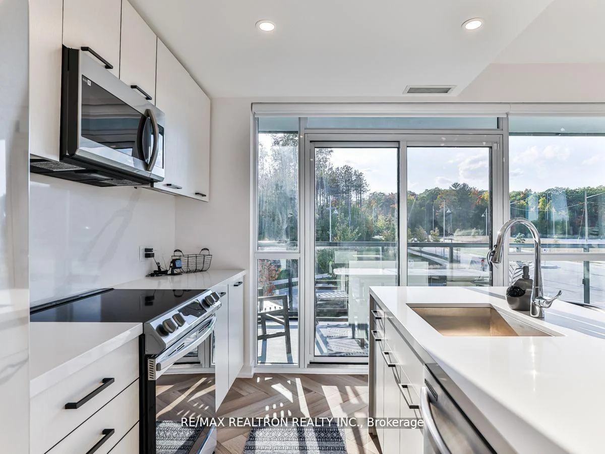Rare wraparound terrace facing the forest! As you enter, a beautiful corridor leads you through to a living space, bedroom, bathroom, and kitchen that boasts numerous upgrades, including a stunning waterfall island and gorgeous hardware. The flooring throughout is simply breathtaking. Offering a splendid open-concept living space with access to the balcony. This condo features a balcony that extends all around, you'll be greeted by the enchanting western sunset view of the lush forest. The space is thoughtfully illuminated by pot lights and custom fixtures, and it boasts ample storage to keep your belongings neatly organized. To add a touch of luxury, the Ensuite bathroom is a stunning addition, further enhancing this exceptional living space. So, grab your suitcase and relish the lifestyle of luxury that awaits you here.