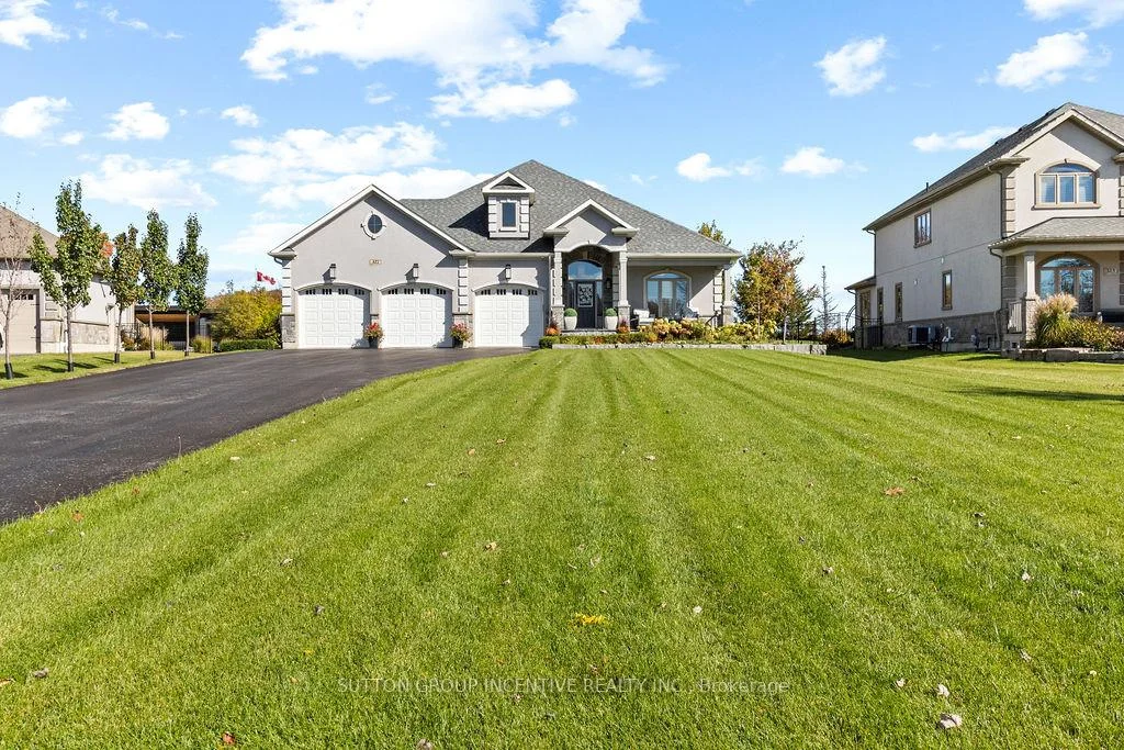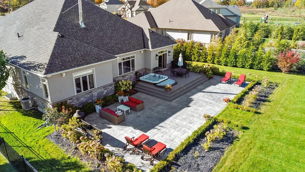 This Stunning Custom Builder Stucco/Stone Bungalow is situated on just over a half-acre private lot, offering a country feel while remaining close to city amenities. It boasts numerous upgrades from the builder and additional enhancements by the owners. Apx 5100 total square feet, finished top to bottom. The property features a gorgeous lot with a huge driveway accommodating 12+ cars (triple-wide at the garage). Inside, you'll find a 14' ceiling in the foyer, a front office/bedroom, a second bedroom, a main 4pc and a 2pc. Hardwood flooring extends throughout the main level, complemented by pot lights, O/S trim, crown molding, 9' doors, and transom windows, creating a bright yet cozy atmosphere. The large master at the rear includes a W/I and 5pc Ensuite with heated floors. The stunning great room offers an open concept design with vaulted ceilings and a floor-to-ceiling stone wood fireplace. The gourmet kitchen features a pantry, wine storage/cooler, B/I glass cupboards, an o/s island, and an o/s stainless steel fridge/freezer combo & gas stove. The DR provides a W/O to a 26x15 composite deck, 8-person hot tub, lighted stairs leading to a huge pattern concrete area-$40k and wrought iron fencing around the rear yard. The exterior is enhanced by mature trees and professional landscaping. The main floor also includes a laundry with a side door and a mudroom leading to a fully insulated garage with an epoxy floor and a gas heater. There is a separate staircase to the basement and a rear door. The gorgeous oak staircase leads to a spectacular Fin Basement with upgraded 9' ceilings, ideal for an in-law setup. It includes a huge R/R with a B/I projector and electric screen, a gas fpl, pot lights, and engineered hardwood t/out. There is a second kitchen with top-end appliances, two bedrooms with 4-piece ens (with heated floors), two exercise rooms (one could be a third bedroom), a utility room, a finished office, and a huge cold room.
