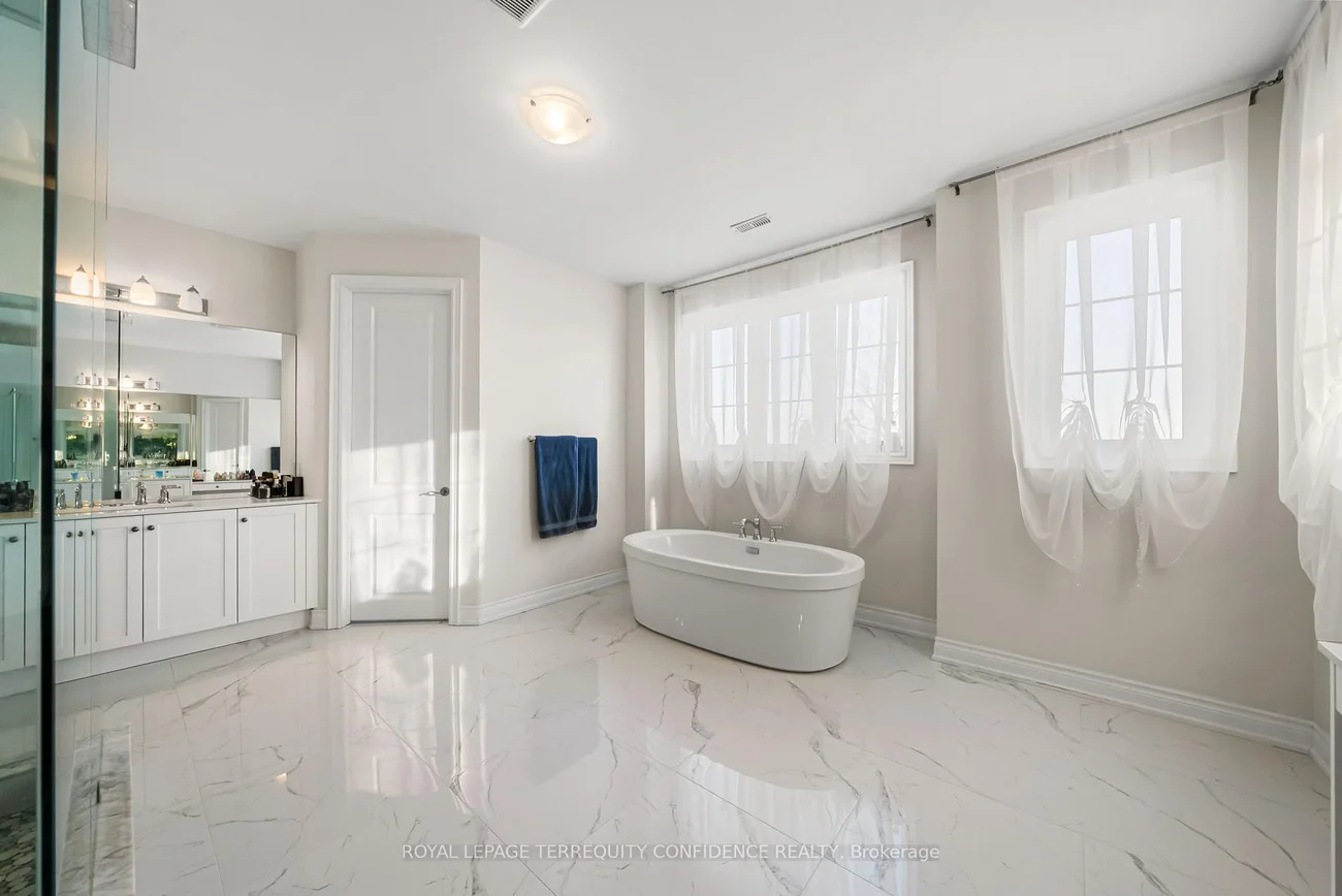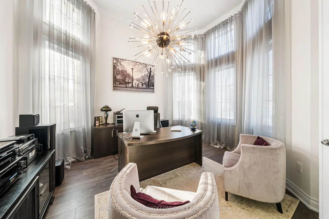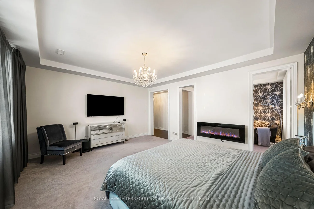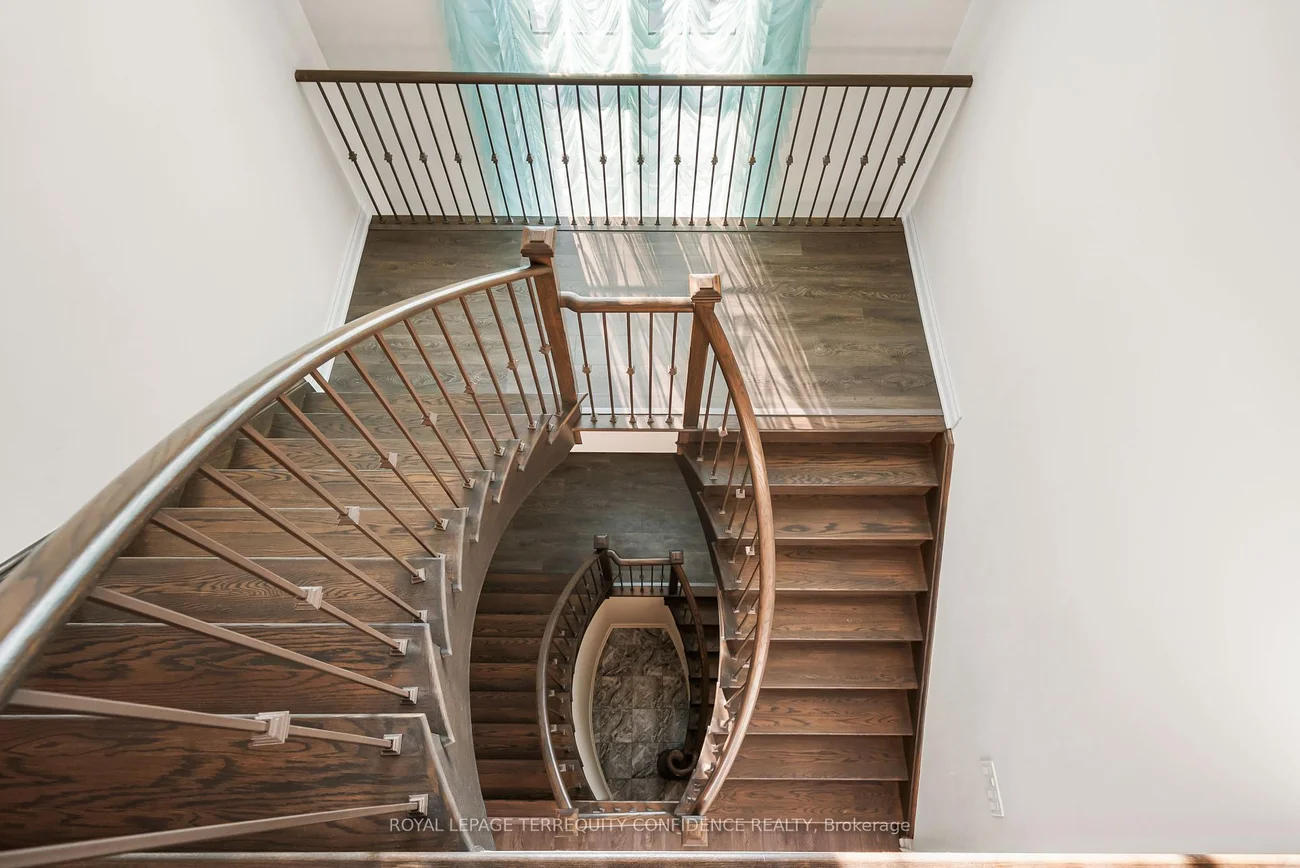 Buy Before it's Gone! Unique opportunity to own a 7500+ sqft home, on a one-of-a-kind, pie-shaped lot. Located at the end of a quiet cul-de-sac, backing onto open green space with only one neighbor to the east- providing utmost privacy. This meticulously maintained home also boasts an exceptional 75' frontage with south exposure, 4900+ sqft above grade, large principal rooms, & a 3 car garage! Enter to be greeted by the dramatic foyer with soaring double-height ceilings and double closets, an exclusive main floor office with high ceilings & floor-to-ceiling windows, formal living & dining rooms with architectural columns, elegant chef's kitchen with an oversized island, quartz counters, 72" Sub-Zero fridge/freezer, Wolf gas cooktop, & dedicated servery with built-ins, a bright breakfast area overlooking the backyard, and a spacious family room complete with a fireplace & walk-out to the porch. Upstairs, discover 4 spacious bedrooms, each with their own ensuite; and a versatile den. The primary suite is a private sanctuary, with two walk-in his & hers closets, a sitting area, fireplace, and a 5-piece spa-inspired ensuite, with an oversized glass shower. Downstairs, the partially finished basement includes a luxurious state-of-the-art sauna, gym/yoga space, lounge area/recreation room, and rough-ins for additional bathroom and kitchen/bar. Additional features throughout the home include: a mudroom with access from the garage, custom cabinetry, custom jacuzzi (backyard), 10' high ceilings on main, crown moulding, French doors, and generous storage (including space under rear porch). In the peaceful backyard, enjoy the south-facing, private view from the balustrade porch, or in the relaxing jacuzzi. From the front porch, the location provides views of the CN Tower, and forest trail directly across the street. Only minutes to nearby amenities. Live in the perfect blend of seclusion and accessibility.