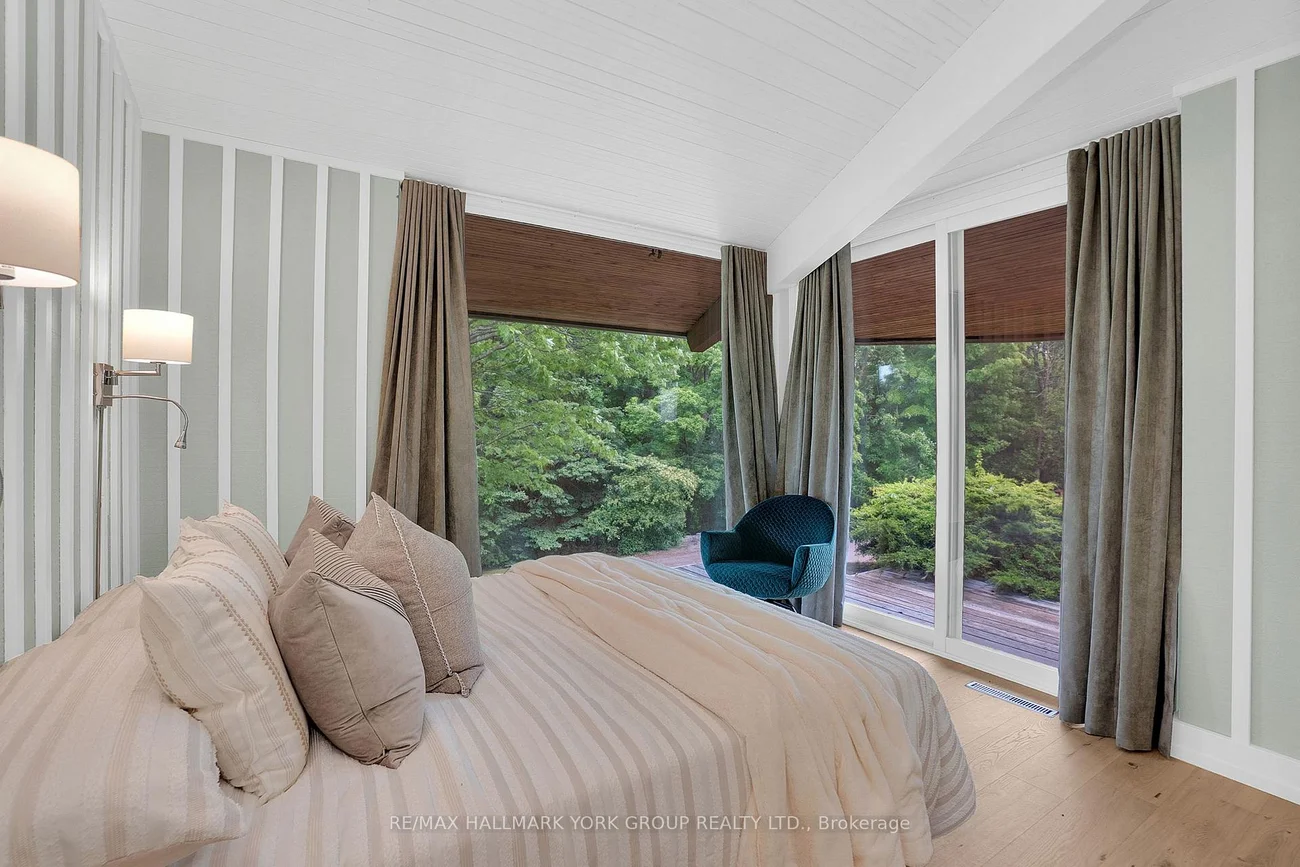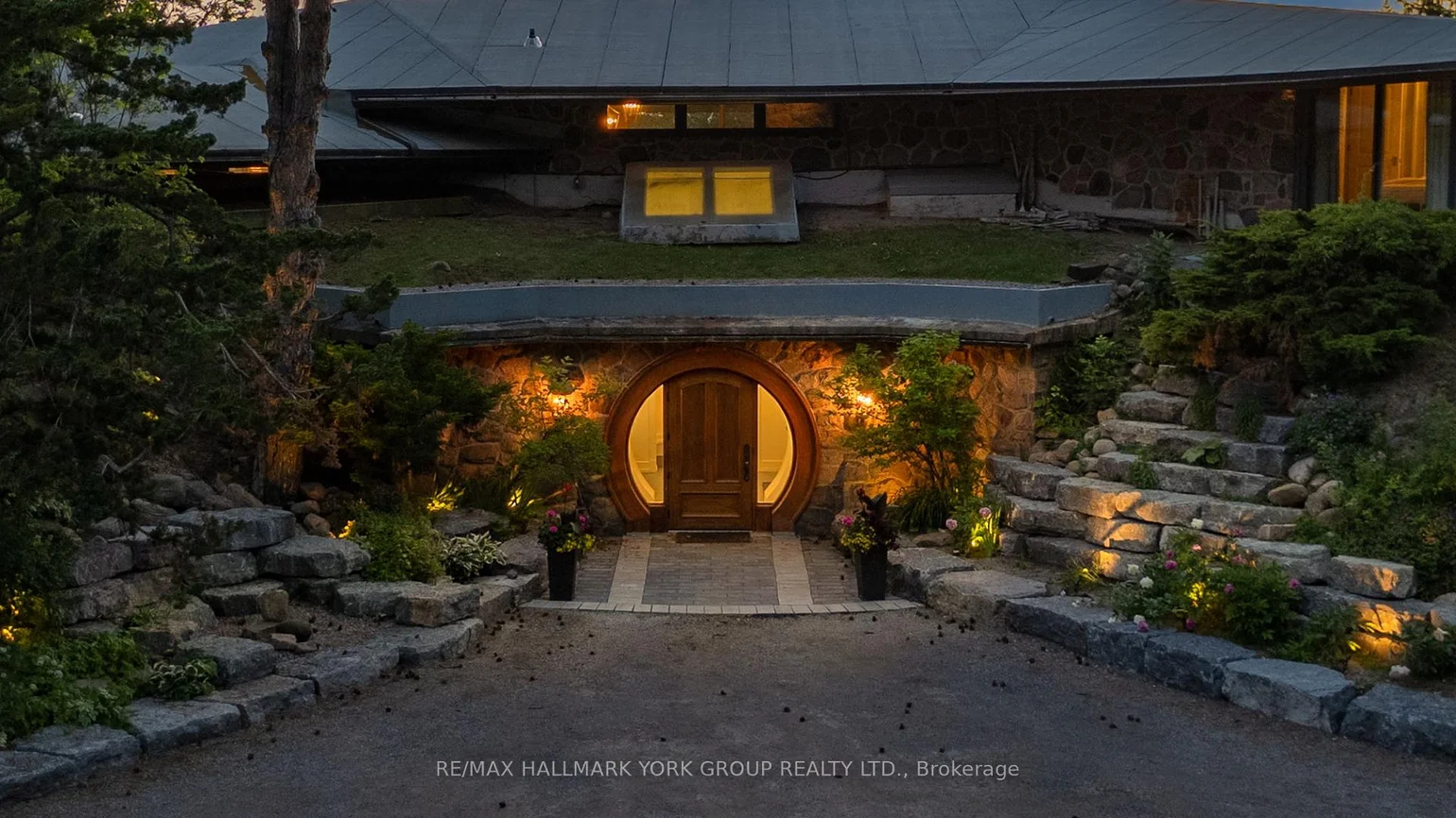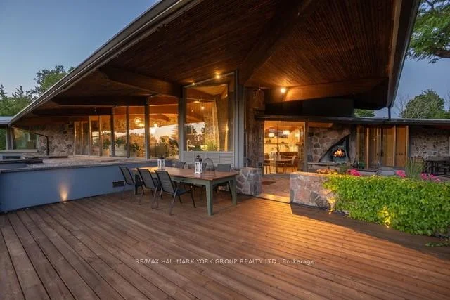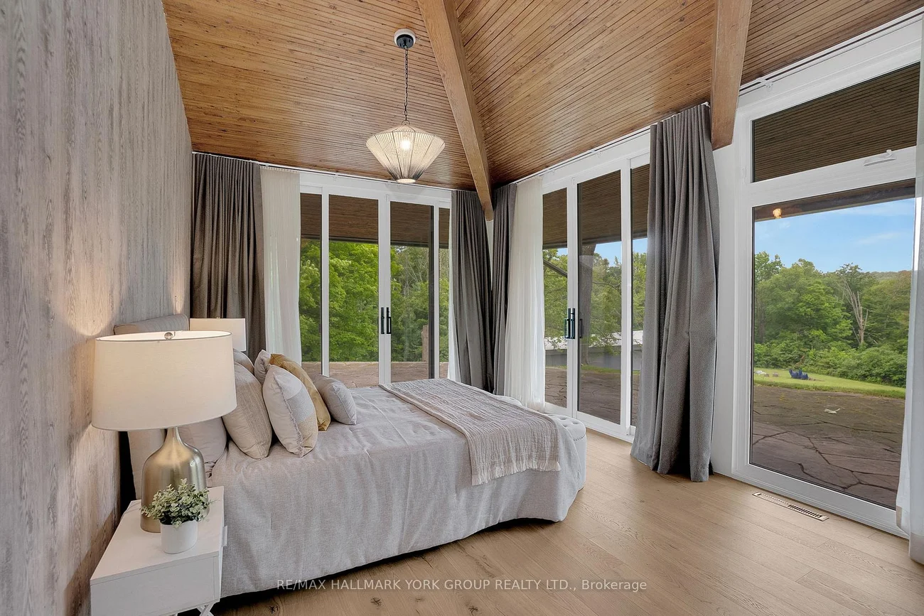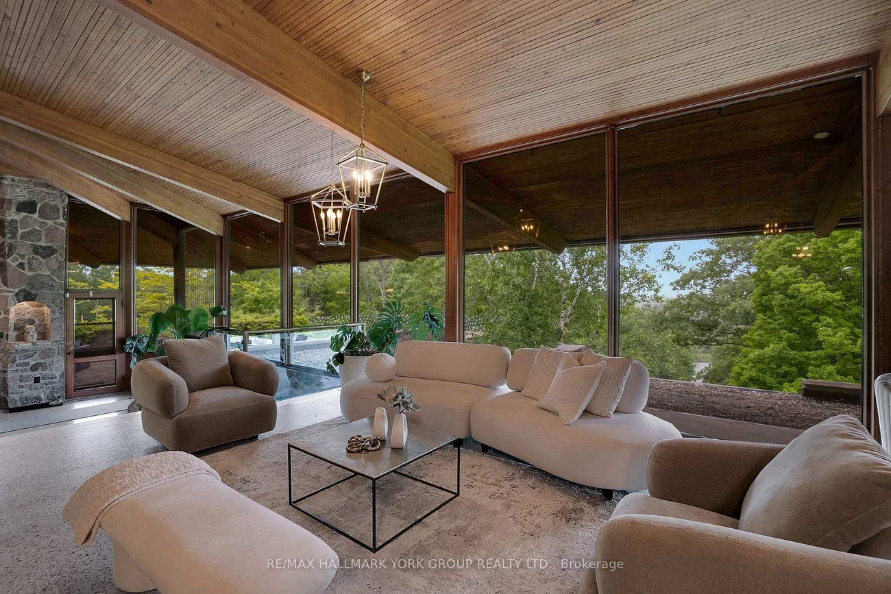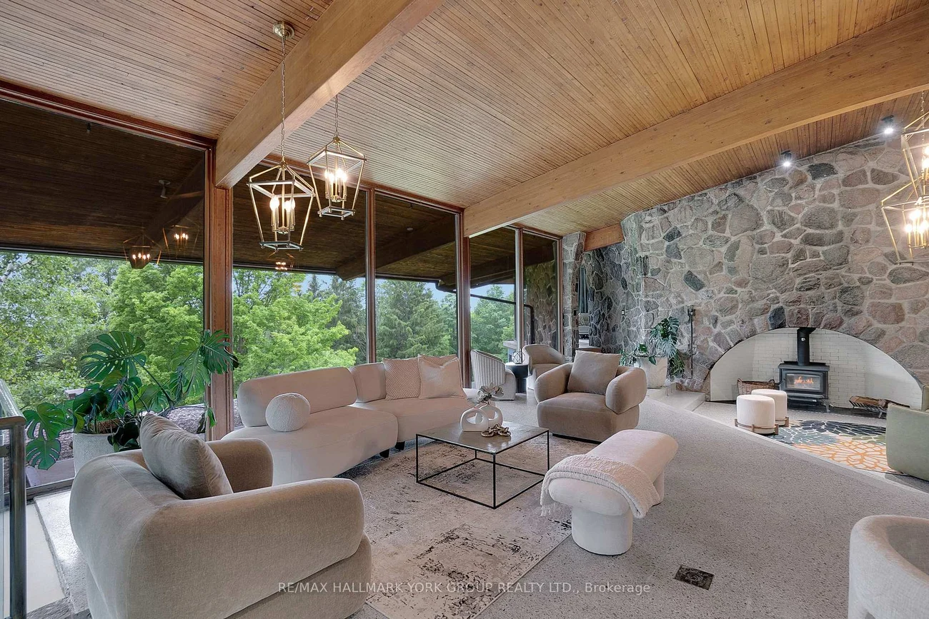 Welcome to an extraordinary estate tucked away behind welcoming stone pillars and a winding forested driveway! This is a work of art designed by the legendary Grant Whatmough and Gardiner Cowan, with distinctive Frank Lloyd Wright style of Architecture. This iconic Mid-Century Modern residence is gracefully integrated into 32 acres of majestic land, where nature and architecture exist in perfect harmony. From the moment you approach the stunning entry door, you're drawn into a world of timeless design and serene beauty. This home is lovingly maintained with extensive renovations, while preserving the character and soul of this home, Including Floor-to-ceiling windows bring the outdoors in, Stone fireplaces indoor and out, original stone walls and impressive wood beams throughout. Spanning approximately 5,000 sq ft, the main residence features 6 bedrooms, 7 bathrooms, an office, a meditation room, and a separate nanny suite. Multiple terraces and decks surround the home, offering breathtaking views of the land, and a tranquil lake creating the feel of a private luxury retreat. This property features a rare second home- fully renovated and approximately 3,500 sq ft-offering 3 bedrooms, 4 bathrooms, and a massive loft space! This second home is ideal for an extended family! There is an additional Yoga studio with an outdoor shower! a Detached garage/ workshop, a charming cedar Cabin with Sauna and Cold plunge, a Covered cabana for entertaining or relaxing on the property. This is a once-in-a-lifetime opportunity to own an architecturally significant estate in the prestigious King Township. With unmatched privacy, lush surroundings, and two beautifully appointed homes, this property is truly a timeless work of art. Don't Miss it!