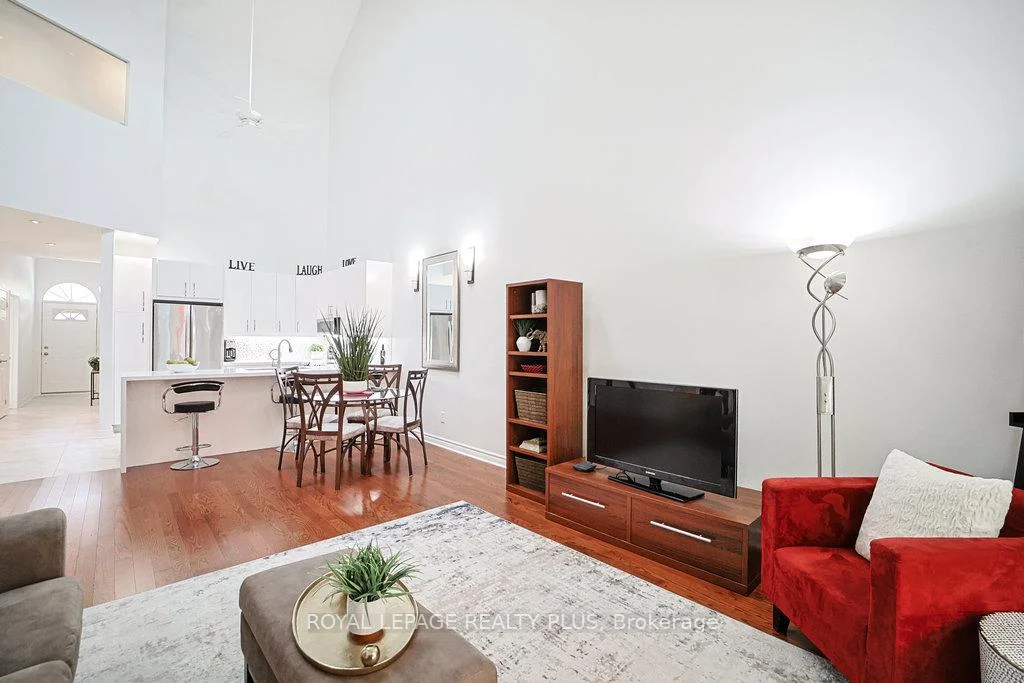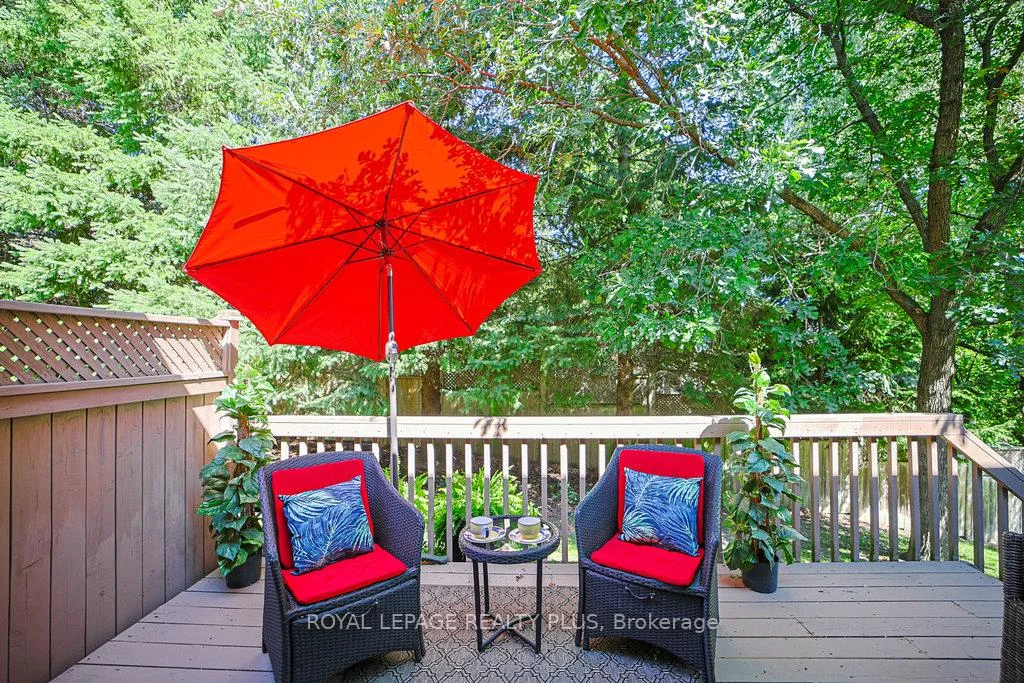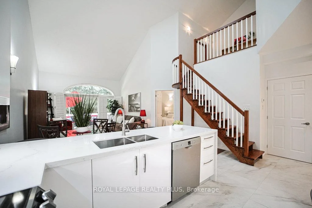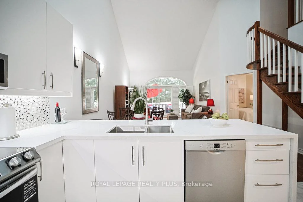 MAIN FLOOR PRIMARY BEDROOM & ENSUITE - Renovated, Executive Townhome, rarely available Bungaloft with Main Floor Primary Bedroom & Ensuite. Nestled on a cull de sac in the private enclave of Turtle Creek, backing onto ravine. Just steps to Lake Ontario, nature trails & Jack Darling Park. This home backs onto mature combination of coniferous and evergreen trees, making for a most private & serene retreat. Inside the open concept layout features an impressive great room with soaring 23 foot vaulted ceilings, rich hardwood floors & a walk-out to a spacious deck overlooking the yard & mature trees. A beautiful renovated Kitchen boasts Carrara style quartz countertops with waterfall feature on the peninsula. Generous counter provides space for a breakfast bar or an awesome area for entertaining. Soft Close cabinets provide a choice of Pantry with slide out drawers, Pot Drawers, Tray Cupboards-Lazy Susan's, Room for everything! The PRIMARY BEDROOM, ON THE GROUND LEVEL, overlooks the natural greenery from the picture window, complete with renovated washroom with oversized shower, and sooo much closet space with built in cabinetry. The spacious 2nd bedroom also on the main floor, and with a vaulted ceiling, overlooks the garden & enjoys an oversize closet. The Loft boasts a relaxing sitting area overlooking the great room & includes a 3rd bedroom, complete with full washroom and walk-in closet. The lower level has a finished family room area with above grade window & corner fireplace. There is also a large unfinished area awaiting your imagination. There are LAUNDRY facilities on both MAIN FLOOR & lower level. New windows throughout, New patio door-everything is ready Just move in. Conveniently located in the vibrant community of Clarkson and Port Credit. Enjoy the festivals, many restaurants & shopping. Easy access to Public Transit & Go train. The perfect combination of nature and urban living.