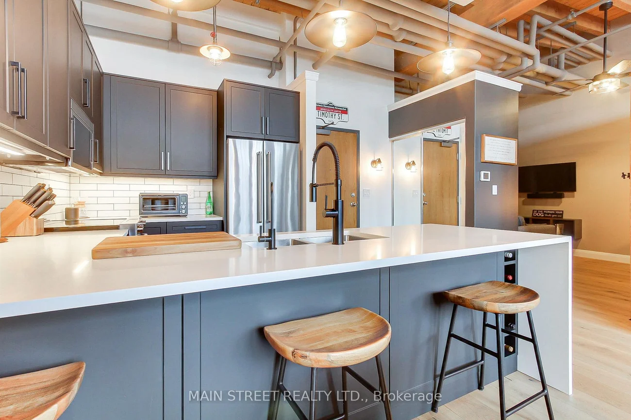 Welcome to Unit 310 at 543 Timothy Street - a stylish loft in the heart of Newmarket, offering modern living with urban flair. This bright and open-concept suite features soaring ceilings, large windows, and an efficient layout perfect for professionals, downsizers or first-time buyers. The newer kitchen is beautifully updated with contemporary finishes, ample cabinetry, and generous quartz waterfall counter, ideal for cooking and entertaining. The renovated bathroom adds a fresh, spa-like touch to everyday living. Enjoy the convenience of in-suite laundry, 2 dedicated parking spots one surface and the other underground, and a well-managed building just steps from Main Street shops, restaurants, trails, and transit. A fantastic opportunity to own a move-in-ready loft in one of Newmarket's most walkable locations. Recent renos are Kitchen, Faucets, Quartz Waterfall Counters, Ceramic Backsplash, Appliances, Light Fixtures, Bathroom, Engineered Hardwood Floors and top of the line Custom Barn Doors. An exceptional west exposure delivers panoramic sunset views of Historical Downtown Newmarket and radiant natural light throughout the day. Black Upgraded Interior Windows. New windows were installed last year, and included in the maintenance fee is $240 to pay off remaining loan balance for approx 4 years. Amenities included are Gym, Top floor patio with 2 BBQ, Theatre room, Games Room, Board meeting room, Large party room with a professional kitchen.