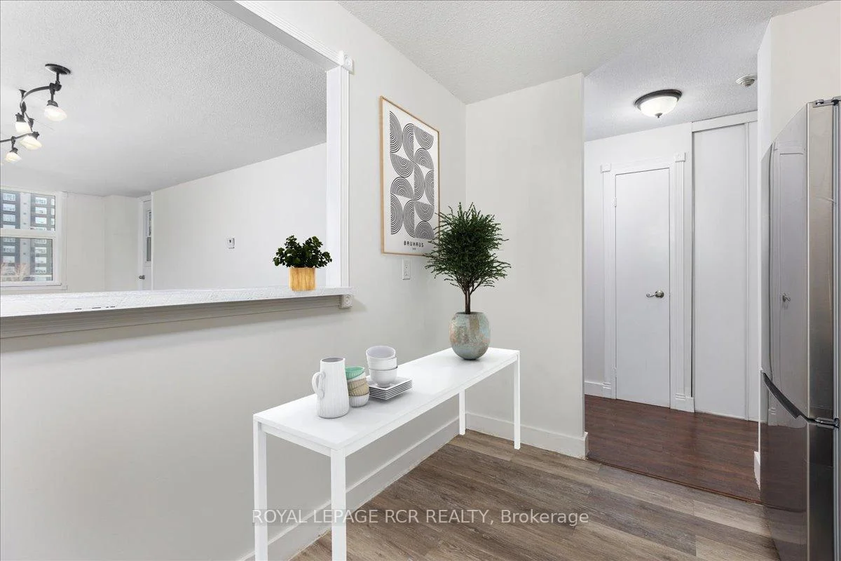 Beautifully upgraded and move-in ready, this bright 1 + 1 bedroom, 1-bath condo offers unbeatable value in central Newmarket. Featuring engineered hardwood floors throughout the living/dining area, main hall, and bedroom, plus updated baseboards and freshly painted with a modern paint colour. The open-concept living and dining space flows to a west-facing balcony with sweeping views and evening sunsets. Enjoy a spacious, modern kitchen with abundant cabinetry, lots of counter-space, a glass backsplash and new stainless steel fridge (2025). A large bonus space is ideal as a home office, walk-in pantry, or extra storage. Updated 4-piece bathroom, newer windows, and a new patio door enhance this condo is move-in ready. One outdoor parking space and one locker included. Prime location steps to Upper Canada Mall, GO Station, restaurants, shops, parks, schools, and just minutes to Hwy 404 or Hwy 400. Perfect for first-time buyers or those seeking affordable living in a thriving, walkable community. Pride of ownership throughout! **Pictures have been virtually staged**