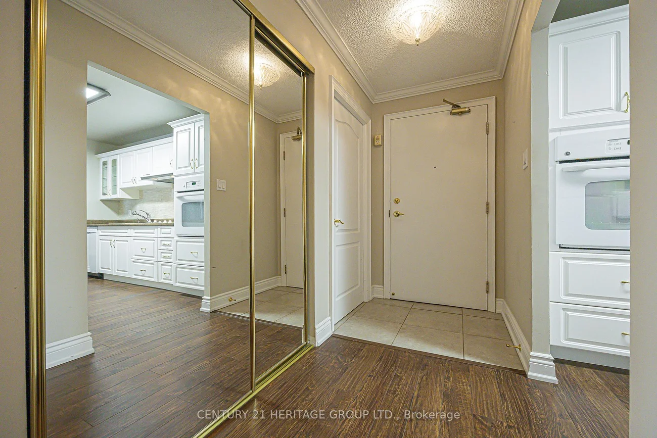 Upgrades galore! Stunning unit close to the elevator, with an ultra-convenient parking spot. Heated washroom floors, covered balcony with 2 entrances, no carpet. Welcome home to Heritage North! This spacious 1 bedroom unit features a western view of sunsets, with entrances from both the living room and the bedroom, a true rarity in this building. Gorgeous open concept and updates throughout. Modern kitchen features a built-in oven, cooktop, stone backsplash and modern cabinets. Spa-like bathroom has a heated floor, and simply gleams with mosaic tile, glass shower enclosure, porcelain tile and granite counter, as well as a huge linen closet. The large bedroom has double closets and California shutters. With upgraded high baseboards and trim, warm laminate flooring and crown moulding throughout, this condo is immaculate! The in-suite laundry room with ceramic floor is simply massive - no need for a storage locker! The building is pristine and well maintained, with recent investments in new exterior balconies and railings. A close-knit community welcomes you with all the amenities: main floor reception room, games room with billiards and shuffleboard, library, gym, sauna, party room and barbecue patio, all situated on almost 10 acres of green space. The grounds feature a playground, sports courts and expansive grounds close to local community gardens, incredible trail networks, transit, and of course, all the downtown amenities and services.