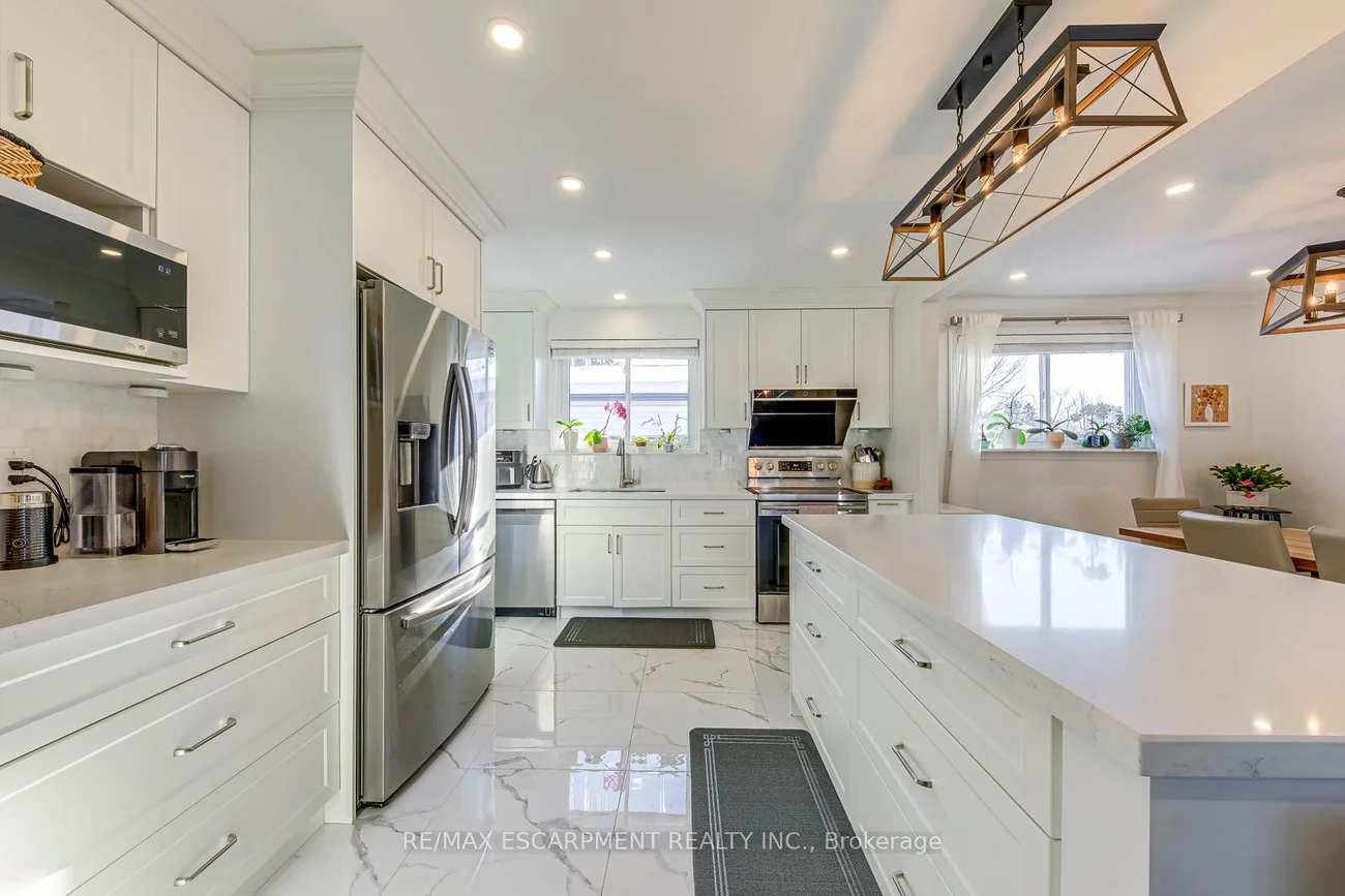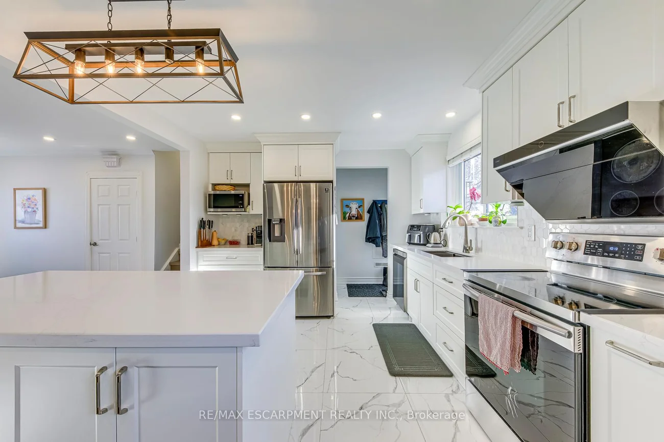 Welcome to this beautifully renovated detached sidesplit located on a quiet, family-friendly crescent in desirable West Oakville. This bright and modern home features an updated kitchen with custom white cabinetry, quartz countertops, a large centre island, stainless steel appliances, and designer lighting, flowing seamlessly into the open-concept dining and living areas highlighted by wide-plank hardwood flooring, pot lights, and oversized windows. The upper level offers three well-proportioned bedrooms and updated bathrooms finished in timeless neutral tones, while the lower level provides a cozy family room with electric fireplace and large above-grade windows, ideal for a media room, home office, or additional living space, plus a partially finished basement for storage or flexible use. Additional features include central air conditioning, forced-air gas heating, landscaped front yard with walkway, in-ground sprinkler system, finished laundry area, private driveway, and attached garage. Conveniently located minutes to Bronte GO Station, QEW and Highway 403, Bronte Village, parks, schools, shopping, and the Oakville waterfront, this move-in-ready home offers comfort, style, and an exceptional neighbourhood for families or professionals alike.