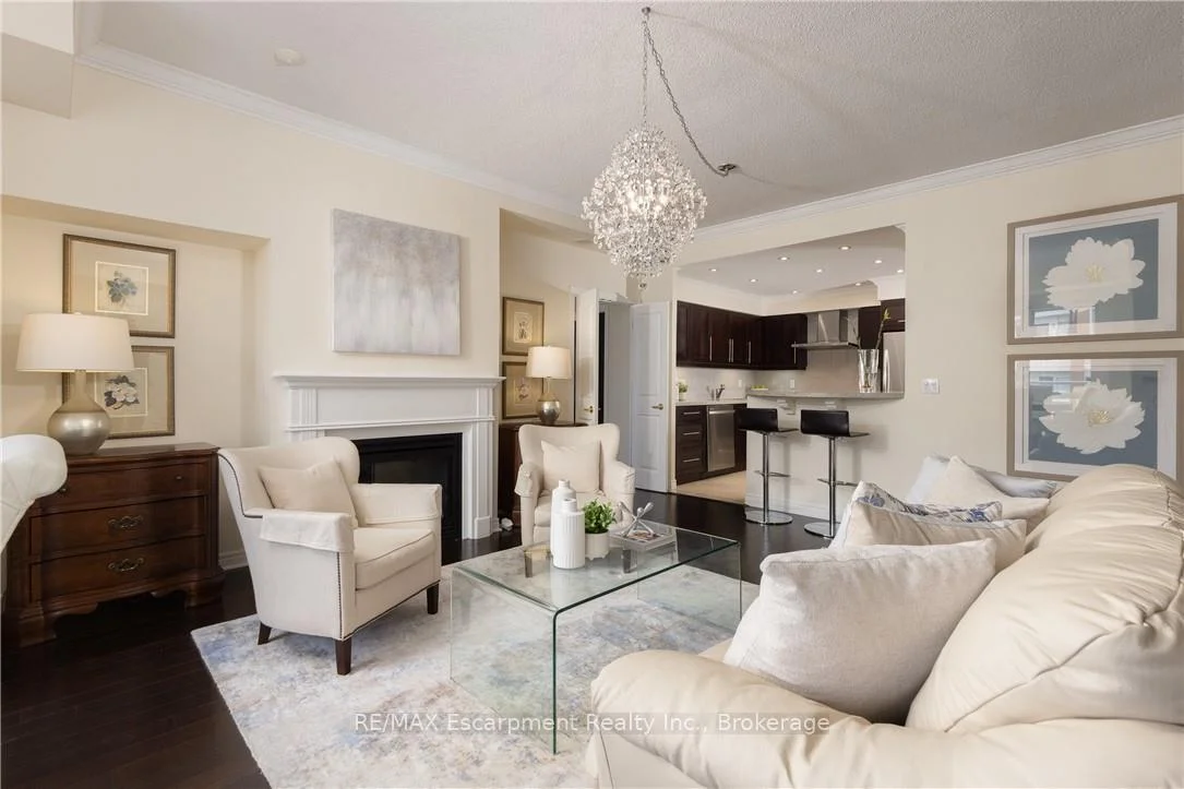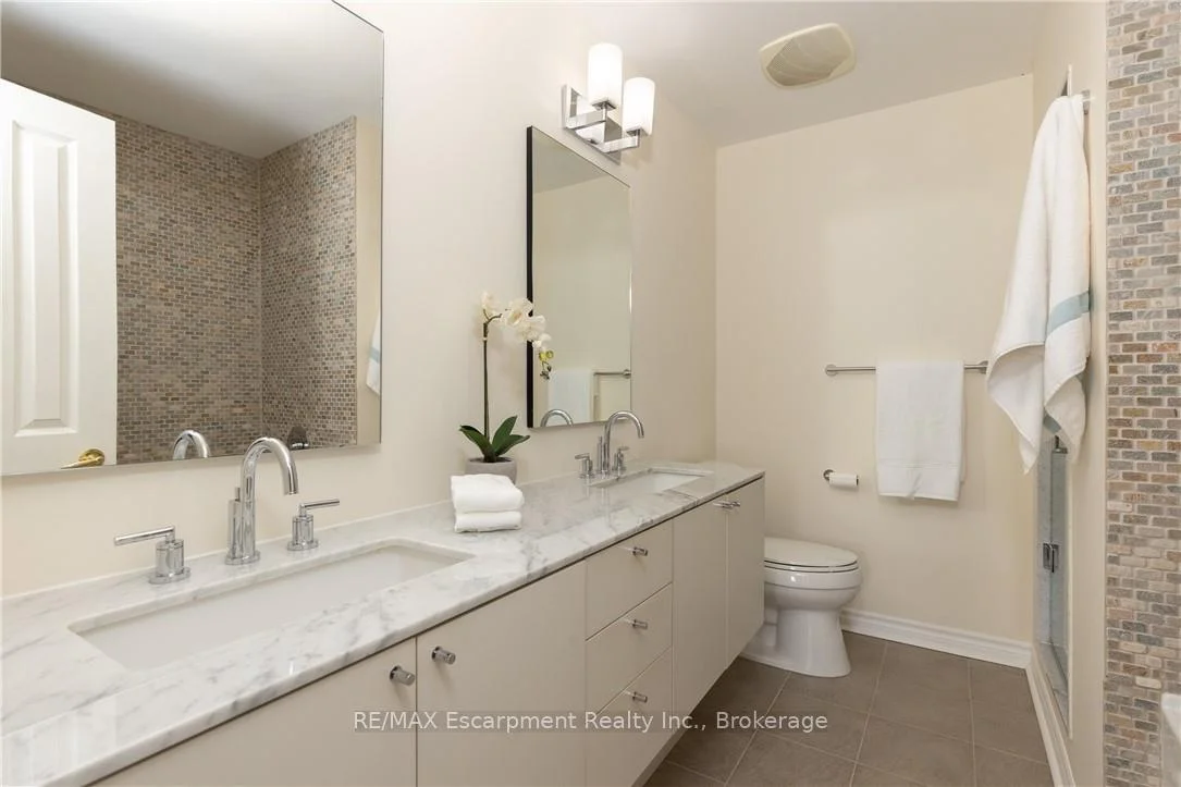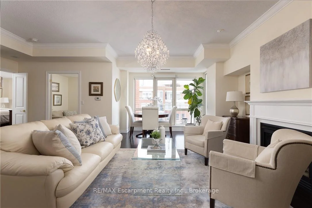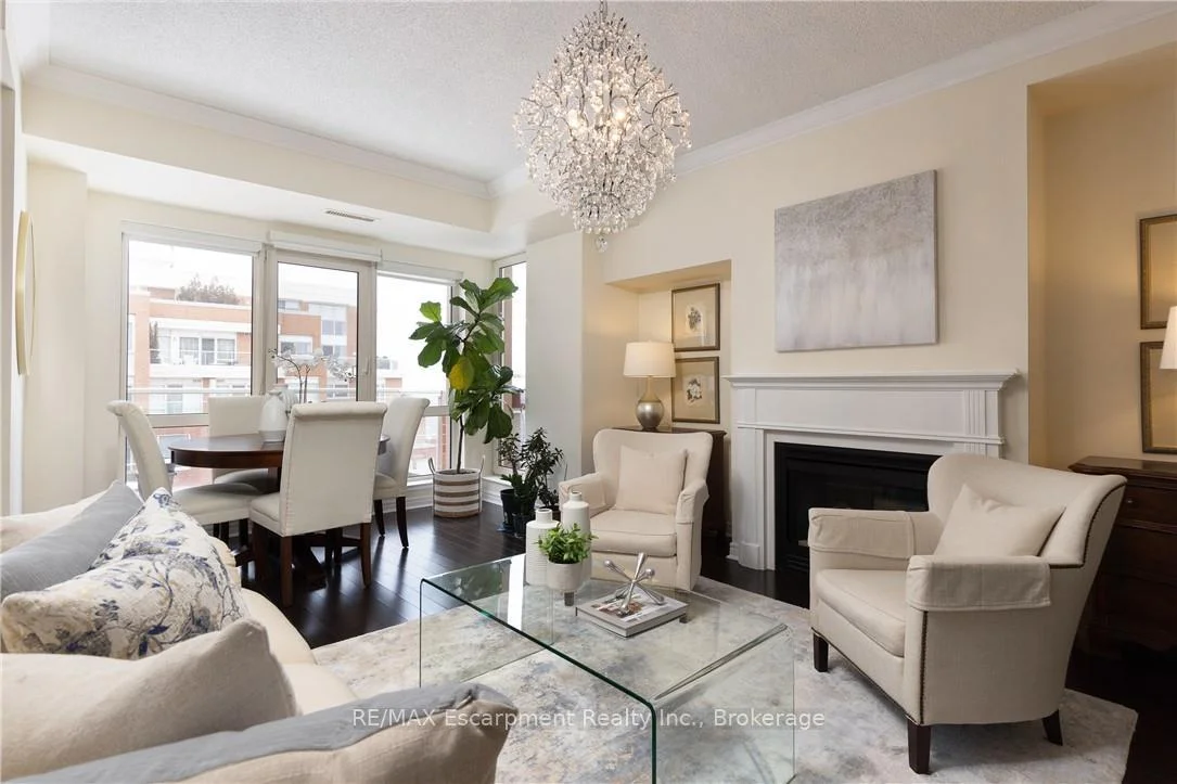 Wake up to tranquil water views in this refined penthouse,where comfort, craftsmanship, and location come together seamlessly.Overlooking the serene waters of Sixteen Mile Creek and views of Lake Ontario,this renovated residence has been thoughtfully redesigned to create a warm and inviting home with timeless finishes and a smooth flow. Inside,elegant engineered hardwood flooring runs throughout the space along with travertine marble in the foyer and kitchen.The updated kitchen is both beautiful and functional,featuring custom cabinetry with under-cabinet lighting,a new updated backsplash,and high end SS appliances.The Great Room and Dining Area boast soaring 9-ft ceilings and a cozy gas fireplace,creating an atmosphere that truly feels like home.With access to two balconies, you can step outside to enjoy uninterrupted views of Sixteen Mile Creek,an ideal setting for morning coffee or quiet evenings.Just off the living area, a versatile den offers flexibility for a home office, gym,or playroom w/ doors for privacy.This thoughtfully designed unit includes a two bedroom split floor plan.The spacious primary suite features a generous walk-in closet and a five-piece ensuite bathroom.The second bedroom also offers a walk-in closet, 4 pc ensuite bathroom, and a walkout to the balcony-perfect for unwinding before bed while enjoying peaceful views. A 2 pc powder room, laundry closet with stackable Bosch W/D & plenty of storage complete the Suite. Offering over 1,400 sq ft of living space,this penthouse includes two premium parking spaces, a locker, and access to outstanding building amenities,incl. an indoor pool, gym, hobby room, & party space-completing this exceptional lifestyle. Ideally positioned in Old Oakville, it's just steps from the Go Train and a 30-minute commute to downtown Toronto and easy access to the highway. Plus, you're just a short stroll away from Whole Foods and downtown Oakville's shops and restaurants. Move in and enjoy!