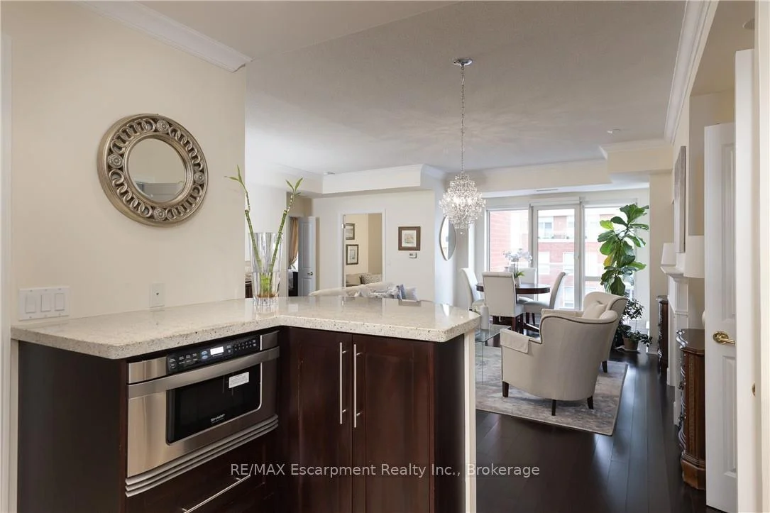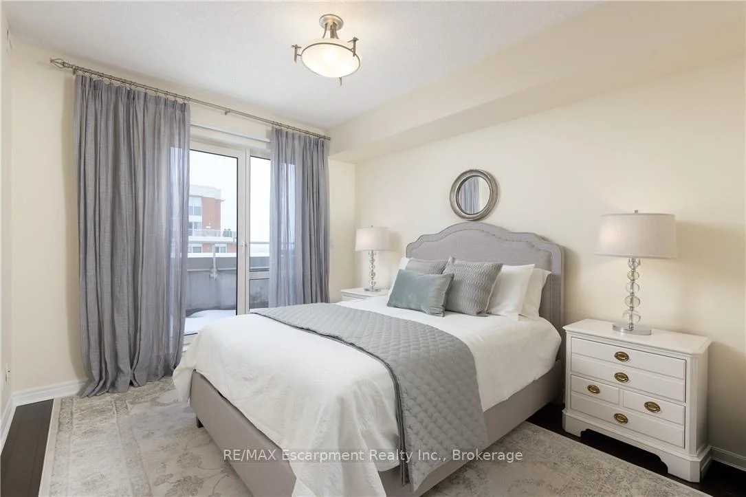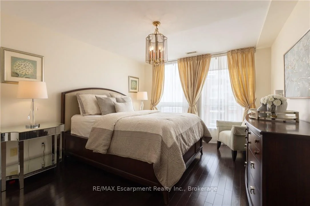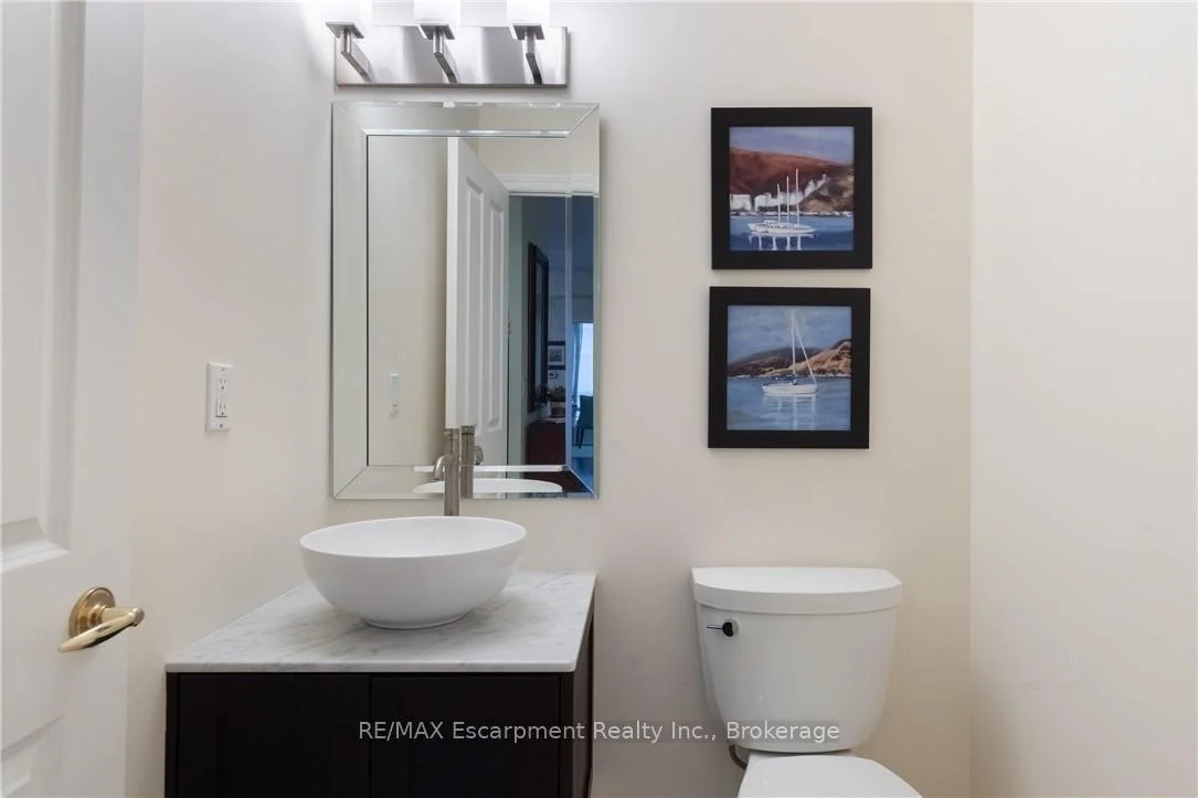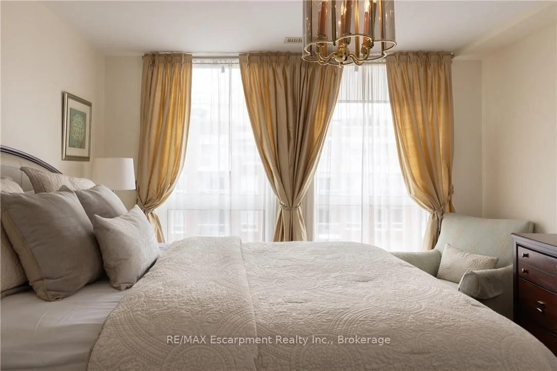 Wake up to tranquil water views in this refined penthouse,where comfort, craftsmanship, and location come together seamlessly.Overlooking the serene waters of Sixteen Mile Creek and views of Lake Ontario,this renovated residence has been thoughtfully redesigned to create a warm and inviting home with timeless finishes and a smooth flow. Inside,elegant engineered hardwood flooring runs throughout the space along with travertine marble in the foyer and kitchen.The updated kitchen is both beautiful and functional,featuring custom cabinetry with under-cabinet lighting,a new updated backsplash,and high end SS appliances.The Great Room and Dining Area boast soaring 9-ft ceilings and a cozy gas fireplace,creating an atmosphere that truly feels like home.With access to two balconies, you can step outside to enjoy uninterrupted views of Sixteen Mile Creek,an ideal setting for morning coffee or quiet evenings.Just off the living area, a versatile den offers flexibility for a home office, gym,or playroom w/ doors for privacy.This thoughtfully designed unit includes a two bedroom split floor plan.The spacious primary suite features a generous walk-in closet and a five-piece ensuite bathroom.The second bedroom also offers a walk-in closet, 4 pc ensuite bathroom, and a walkout to the balcony-perfect for unwinding before bed while enjoying peaceful views. A 2 pc powder room, laundry closet with stackable Bosch W/D & plenty of storage complete the Suite. Offering over 1,400 sq ft of living space,this penthouse includes two premium parking spaces, a locker, and access to outstanding building amenities,incl. an indoor pool, gym, hobby room, & party space-completing this exceptional lifestyle. Ideally positioned in Old Oakville, it's just steps from the Go Train and a 30-minute commute to downtown Toronto and easy access to the highway. Plus, you're just a short stroll away from Whole Foods and downtown Oakville's shops and restaurants. Move in and enjoy!
