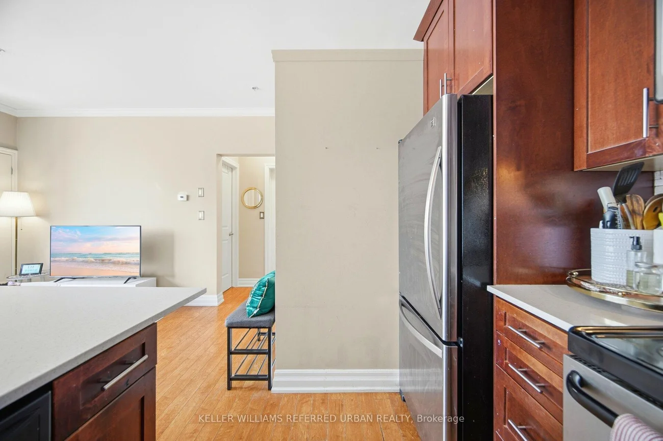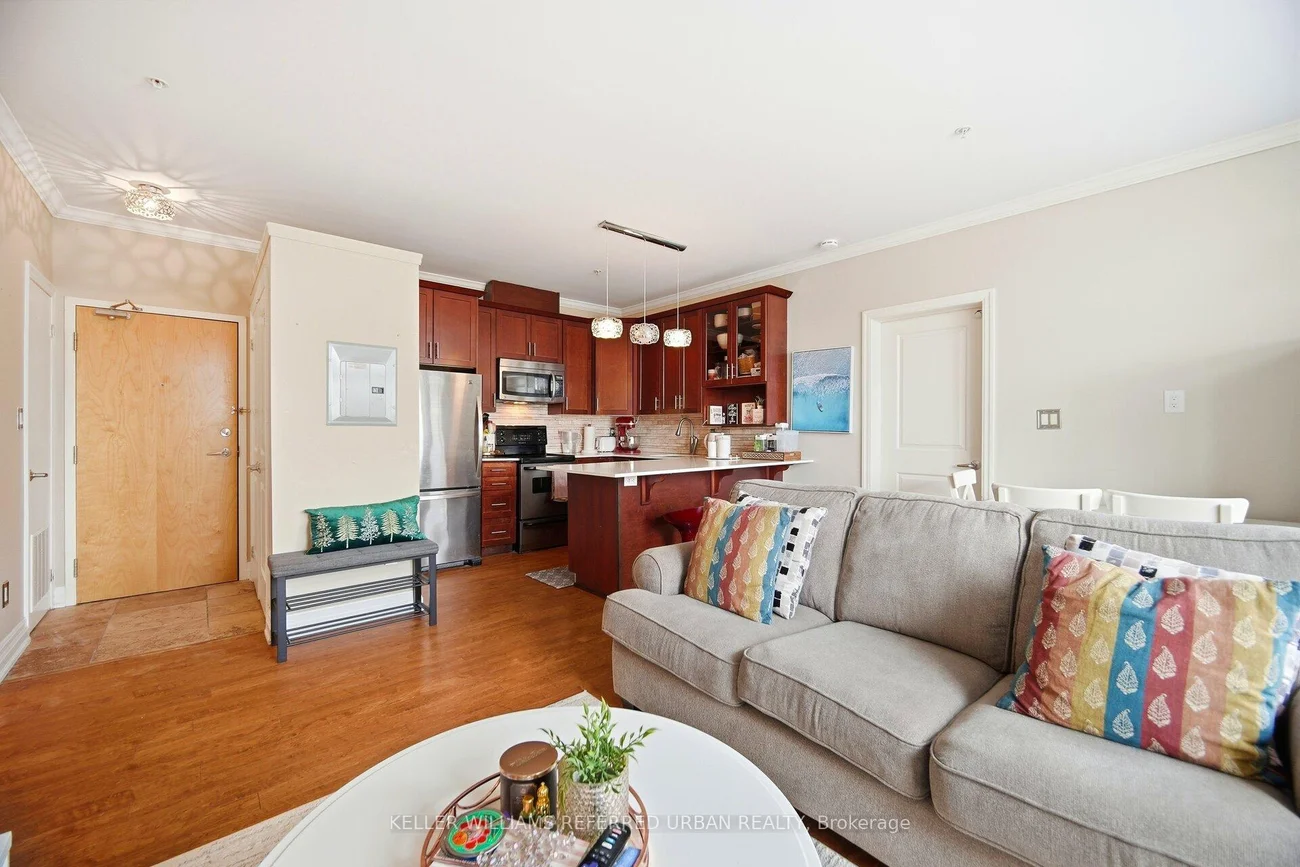Welcome to this bright and well-designed 2-bedroom condo in the heart of vibrant Kerr Village, one of Oakville's most walkable and charming communities. Offering approximately 750 sq. ft. of thoughtfully planned living space, this well-maintained suite is ideal for buyers looking for comfort, functionality, and an unbeatable location. From the moment you enter, the layout flows effortlessly into a sun-filled open-concept living and dining area, creating a warm and inviting space perfect for both everyday living and entertaining. The kitchen is designed with practicality in mind, featuring quartz countertops, ample cabinetry, and a convenient breakfast bar that adds both workspace and casual seating. Both bedrooms are generously sized and positioned for privacy, making the layout feel larger than expected. The bright primary bedroom features large wardrobes, providing excellent storage, while the second bedroom offers great flexibility, making it perfect for a guest room, nursery, home office, or creative space to suit your evolving lifestyle. A full 4-piece bathroom and in-suite laundry add to the comfort and convenience of the home. Step outside onto your private balcony to enjoy fresh air on sunny days, and benefit from the added value of one dedicated parking space. This well-maintained building is renowned for its welcoming community atmosphere and exceptional location. Just steps to local shops, cafés, restaurants, and boutiques in Kerr Village, and only minutes to the GO Station, QEW, scenic waterfront trails, and downtown Oakville, this is a lifestyle defined by convenience, connectivity, and neighbourhood charm.