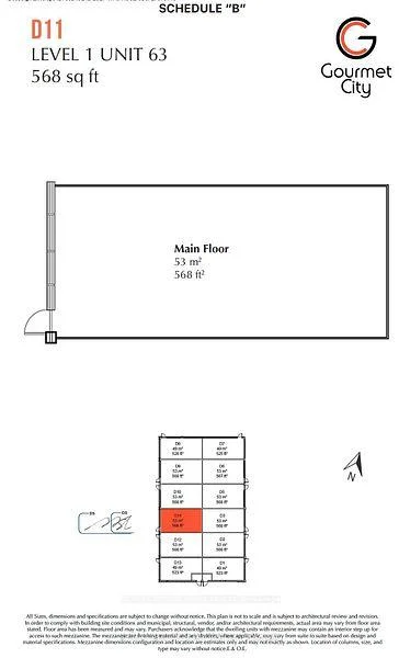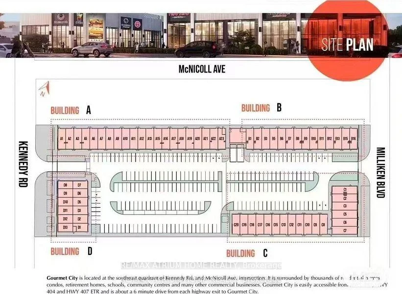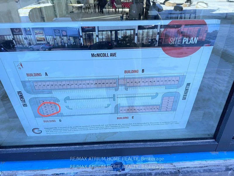 ** Frontage SIGNAGE on KENNEDY ROAD *** Gourmet City Commercial Condos is a newly developed culinary hub in Scarborough, ideally located at the southeast corner of Kennedy Road and McNicoll Avenue. This project offers excellent exposure and accessibility from both Kennedy Road and Milliken Boulevard. Developed by H & H Group, the plaza features modern architecture and high-quality finishes. The site benefits from high visibility and consistent foot traffic, making it ideal for a wide range of business opportunities.This is a brand-new unit with 20-foot high ceilings and in raw condition, ready for customization. The listing includes two combined units (D3 + D11), totaling 1,136 square feet (see floorplan). Permitted uses include restaurant, dine-in bakery, cafe, dessert shop, bubble tea, bar, and moreperfect for serving diverse cultural tastes.Just minutes from Highways 404 and 407. (Tax estimate $1485/mon, Management fee $395/mon, Insurance estimate $100/mon). Unit D11 faces Kennedy Road for prime visibility, while Unit D3 faces the interior parking lot. Features include two entry doors and two electrical panels for flexible use. ***Permitted uses include restaurant, Dining in bakery , cafe, dessert shop, bubble tea, Bar & more****