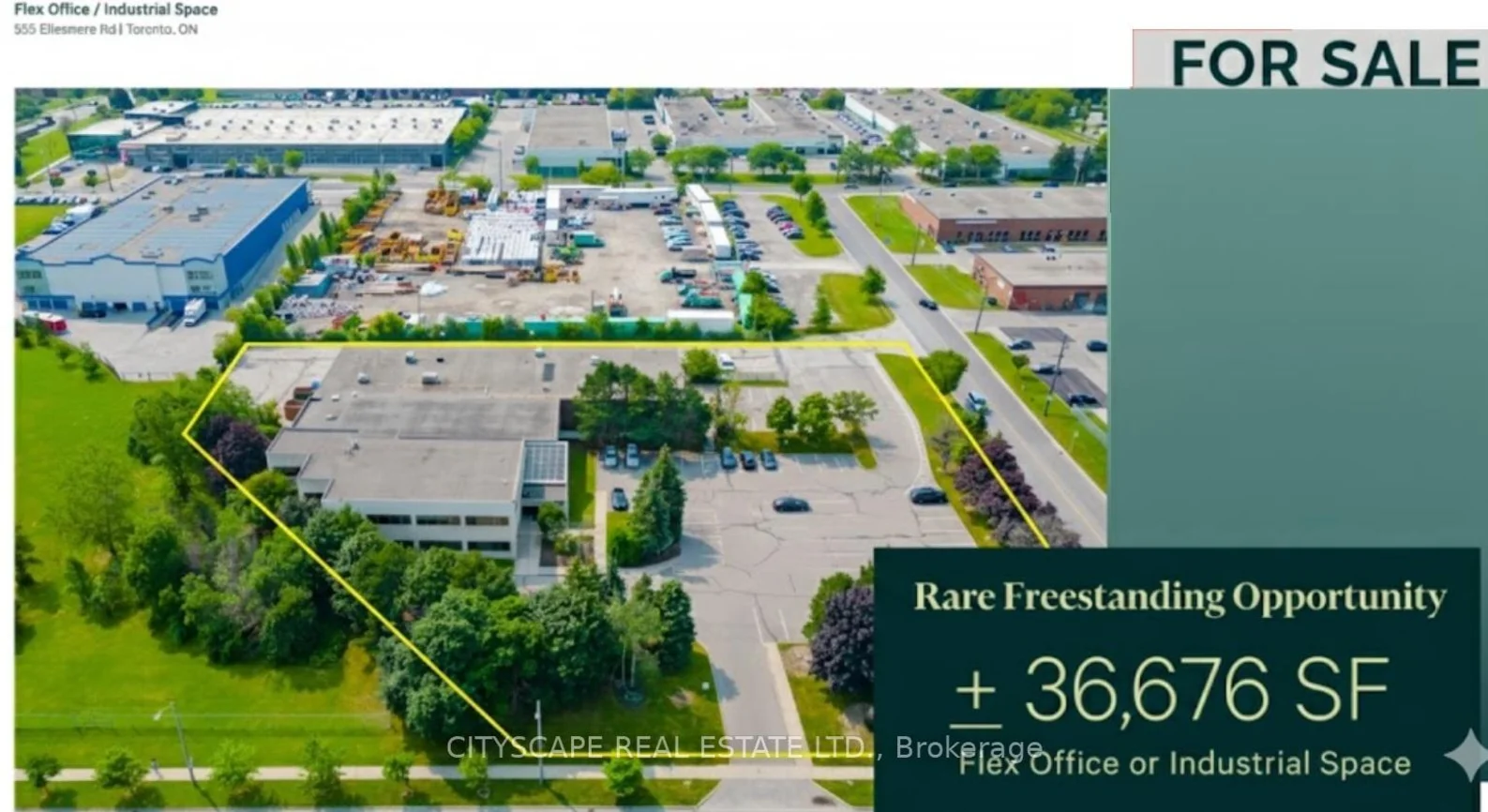 CITYSCAPE REAL ESTATE is pleased to present 555 Ellesmere Road, Toronto, Ontario for sale. This prominent corner property features a flexible office-to-warehouse ratio and is ideally situated near the intersection of Ellesmere Road and Birchmount Road, offering excellent street exposure and accessibility. Conveniently located, the site is approximately 30 minutes to Downtown Toronto and 35 minutes to Toronto Pearson International Airport, making it an attractive option for a wide variety of users. Zoning is highly versatile and permits multiple uses, including office, industrial, educational facilities, and places of worship. The property also benefits from ample on-site parking and strong electrical capacity, making it suitable for a range of business operations. Buyer to perform their own due diligence with respect to zoning, permitted uses, building condition, and all municipal approvals or permits required for their intended use