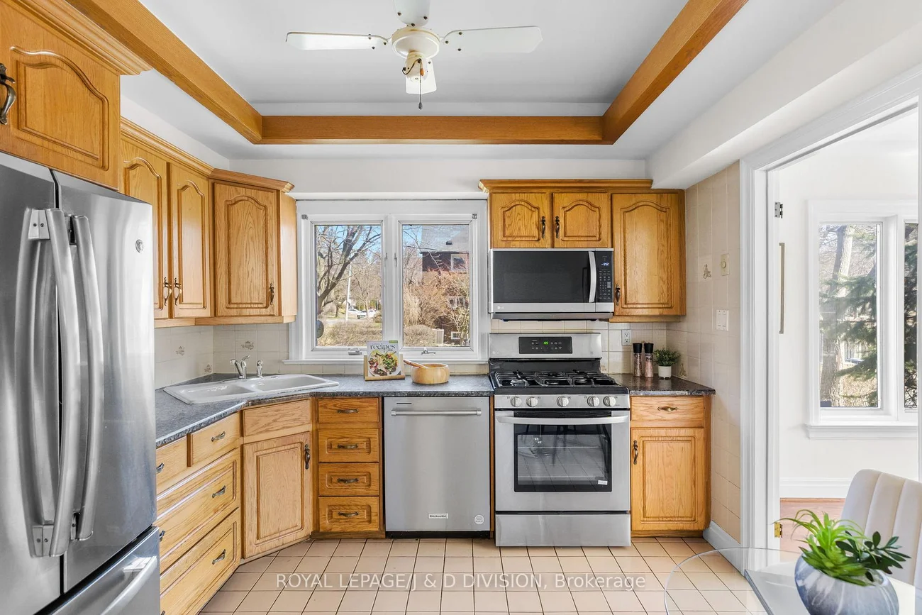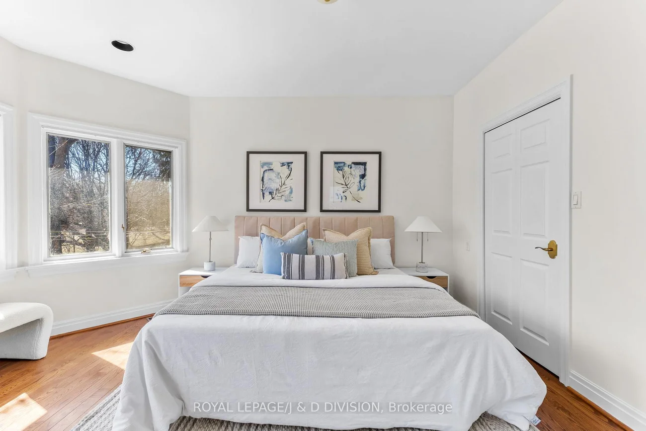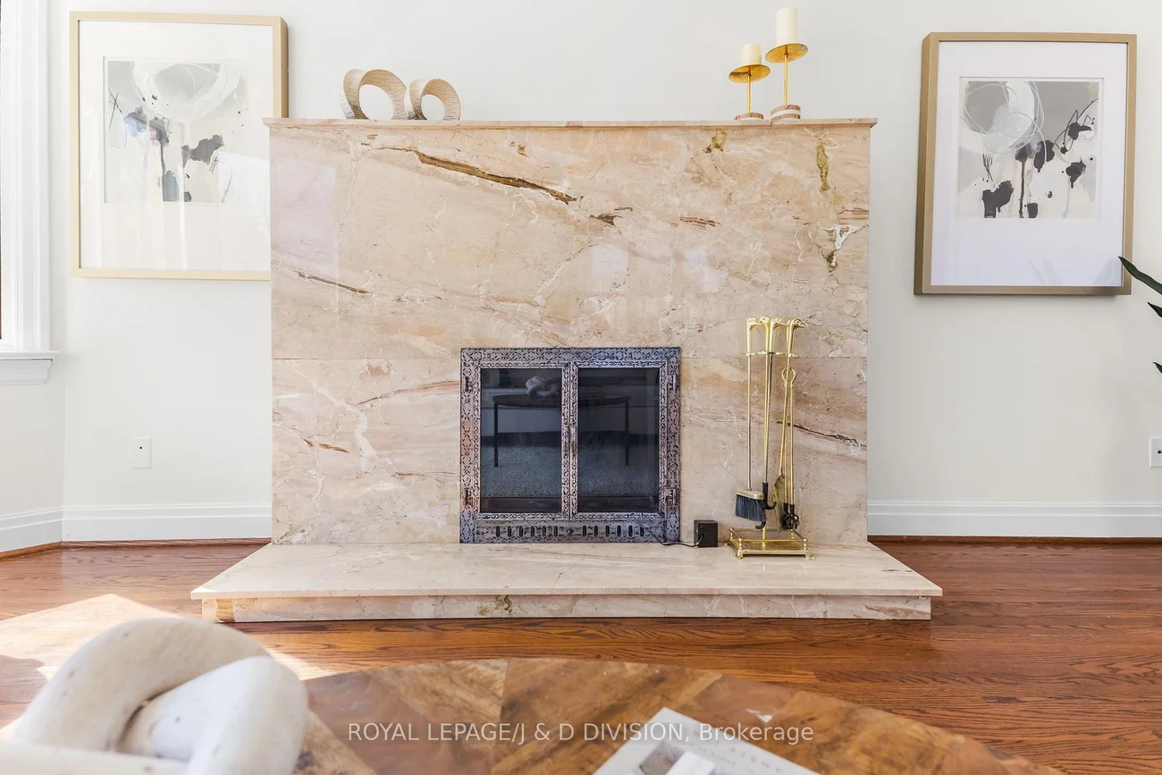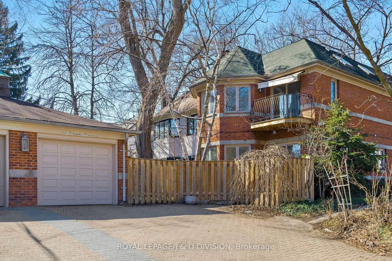 Backing onto Oriole Park, this elegant detached residence in Chaplin Estates offers a rare sense of calm, privacy, and space in one of midtown's most established family neighbourhoods. Set on a beautifully landscaped corner lot, the home feels quietly distinguished from the moment you arrive, with mature gardens framing every approach and a fenced backyard that opens to a peaceful private patio. Inside, the scale is immediately welcoming. A generous foyer with double doors, ample storage, and a discreet powder room introduces a main floor designed for both entertaining and comfortable daily life. To one side, a beautifully appointed sitting room with a bay window, fireplace, and built-in bookshelves offers a refined retreat - equally suited to a formal living room, library, or private home office. Warm oak floors carry throughout the main level, adding richness and continuity. The eat-in kitchen is bright and inviting, with upgraded stainless steel appliances and abundant natural light. It flows into the dining room, where sliding doors open to the garden. The dining room overlooks a stunning sunken family room centered around a statement stone fireplace and with expansive bay windows overlooking the backyard. Upstairs, the primary suite enjoys beautiful views over the park, a spacious closet, a spa-like ensuite with soaker tub, and a private south-facing balcony. Two additional bedrooms with dedicated double closets and a skylit family bath complete the second floor. The finished lower level adds more flexibility, offering a bright recreation room with a second stone fireplace and custom built-ins, a fourth bedroom, a powder room, and a discreet ventilated wine cellar. With detached garage parking, additional driveway space, and easy access to Oriole Park, Davisville Subway Station, the Kay Gardner Beltline Trail, top schools, and the restaurants & shops along Yonge St, this home offers both everyday ease and lasting elegance in an established Toronto enclave.
