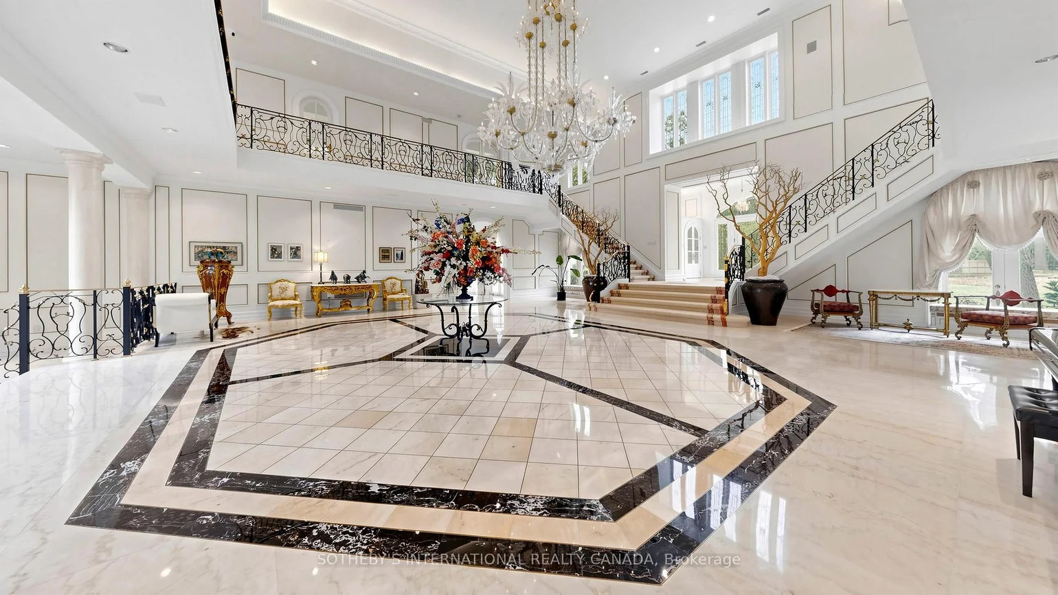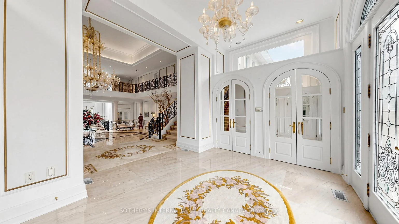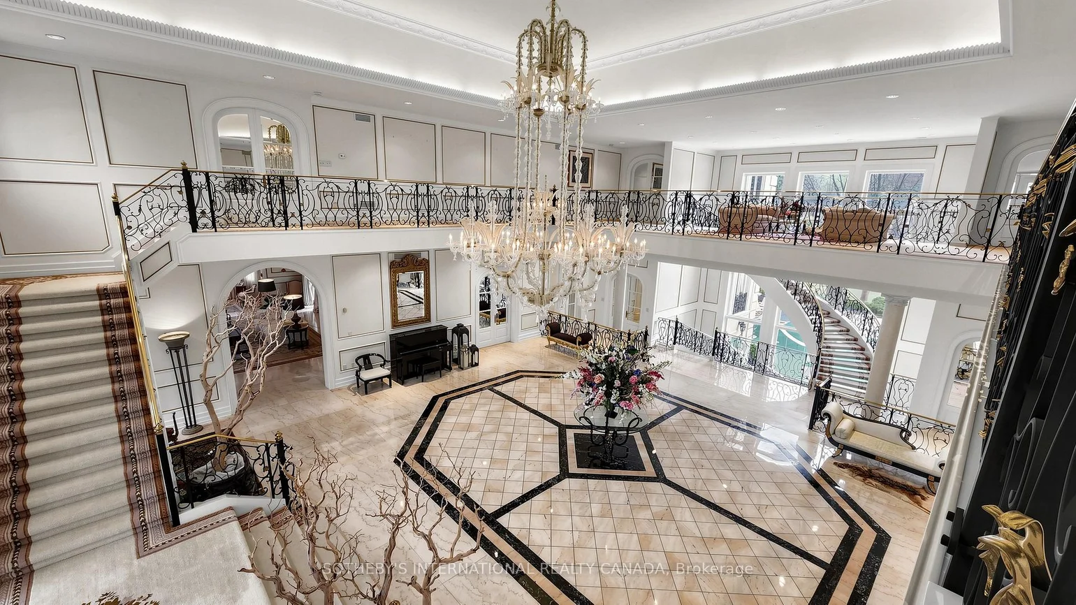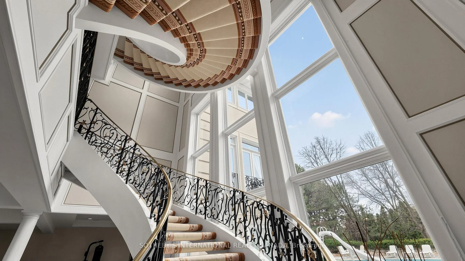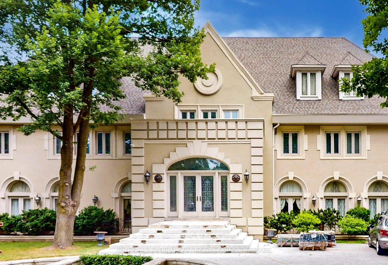 52 Post Rd stands as one of the most distinguished European Neoclassical architectural masterpieces in Bridle Path, Canada's most prestigious residential enclave. Spanning over 25,000 SF, this gated estate is widely regarded as a "Modern Grand Mansion'' of remarkable scale and presence. It seamlessly blends classical symmetry with refined contemporary elegance. Grand, high-arched doorways, intricately patterned marble floors and millwork, sweeping staircases with ornate wrought-iron railings, and monumental architectural proportions establish enduring sophistication and a regal arrival experience. Evoking a Versailles-inspired grandeur, the interiors showcase 14' and 23' soaring ceilings, dramatic stair halls and windows, and dazzling chandeliers that cast a warm, luminous glow throughout. Appx 15,000 SF above grade, incl an unparalleled 300-guest ballroom. Soaring 14' ceiling, 5 +2 generously appointed bedrooms, 13 bathrooms, 3 kitchens. Appx 7,500 SF lower level is thoughtfully designed for comprehensive leisure and entertaining amenities. Lower level features the wellness spa, sauna and hot tub, fitness centre, wine cellar and an extensive billiard room hosting multiple games. A tunnel-connected coach house offers appx 2,500 SF interior, and a 5-car-garage. Sculptural 3-dimensional walls gracefully wrap around a private courtyard, creating a striking focal point. Dramatic 2-storey floor-to-ceiling windows frame serene garden and pool views, cultivating intimate dialogue b/t interior and nature. Resort-inspired backyard featuring an outdoor pool with pool-house, a private tennis court, and a children's playground along expansive lawn and tree-lined tranquil pathway. Set among an extraordinary collection of luxury estates in the Bridle Path, this exceptional location is surrounded by elite public and private schools, renowned Granite Club and Sunnybrook Health Centre. A rare offering defined by prestige, privacy, and elevated lifestyle in the heart of the City.