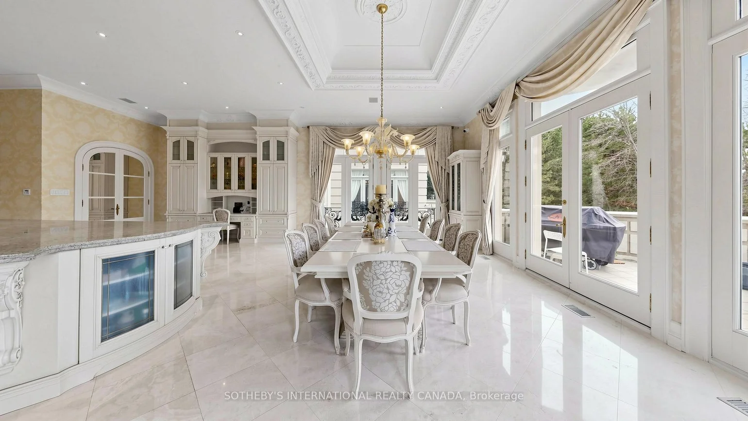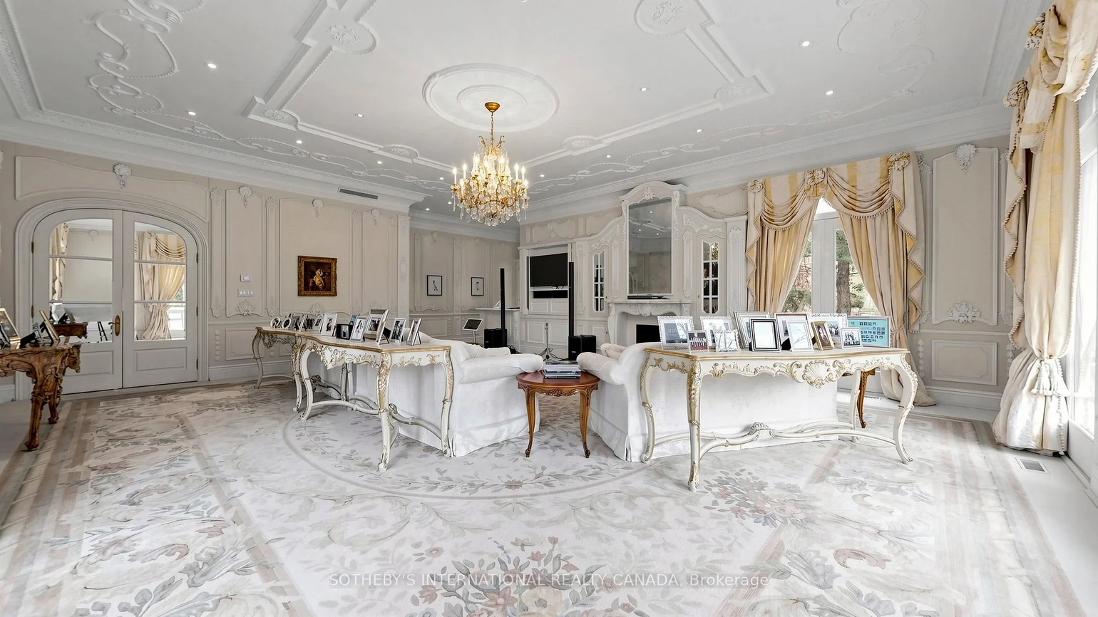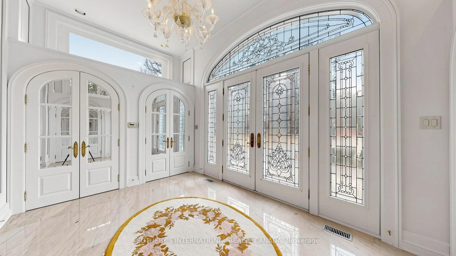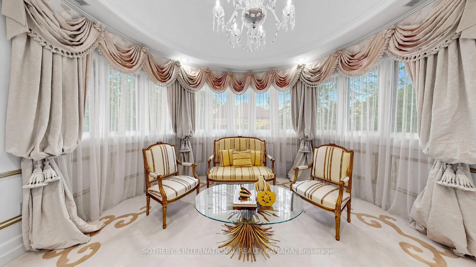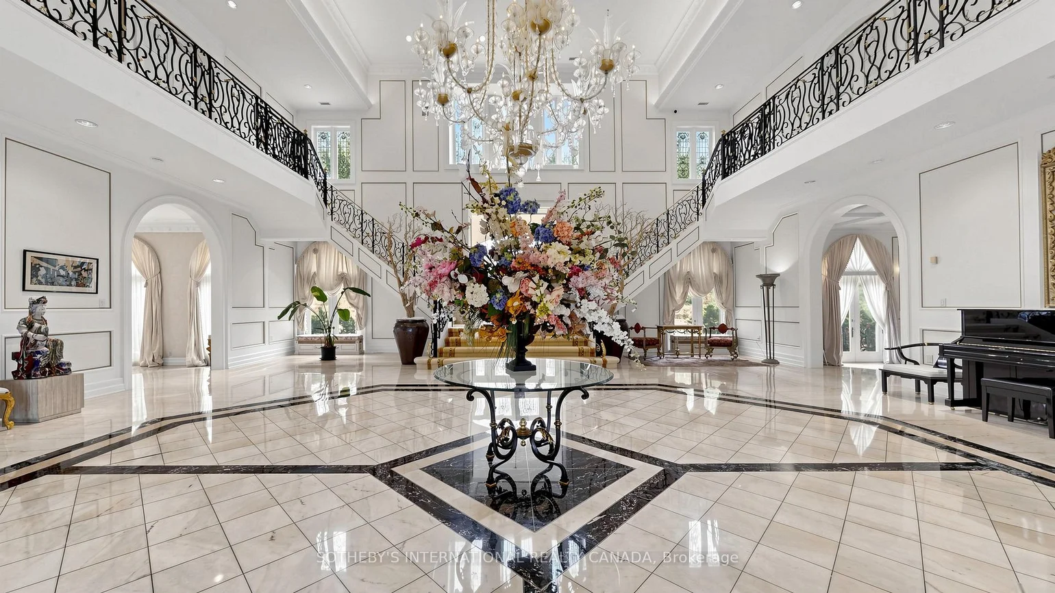 52 Post Rd stands as one of the most distinguished European Neoclassical architectural masterpieces in Bridle Path, Canada's most prestigious residential enclave. Spanning over 25,000 SF, this gated estate is widely regarded as a "Modern Grand Mansion'' of remarkable scale and presence. It seamlessly blends classical symmetry with refined contemporary elegance. Grand, high-arched doorways, intricately patterned marble floors and millwork, sweeping staircases with ornate wrought-iron railings, and monumental architectural proportions establish enduring sophistication and a regal arrival experience. Evoking a Versailles-inspired grandeur, the interiors showcase 14' and 23' soaring ceilings, dramatic stair halls and windows, and dazzling chandeliers that cast a warm, luminous glow throughout. Appx 15,000 SF above grade, incl an unparalleled 300-guest ballroom. Soaring 14' ceiling, 5 +2 generously appointed bedrooms, 13 bathrooms, 3 kitchens. Appx 7,500 SF lower level is thoughtfully designed for comprehensive leisure and entertaining amenities. Lower level features the wellness spa, sauna and hot tub, fitness centre, wine cellar and an extensive billiard room hosting multiple games. A tunnel-connected coach house offers appx 2,500 SF interior, and a 5-car-garage. Sculptural 3-dimensional walls gracefully wrap around a private courtyard, creating a striking focal point. Dramatic 2-storey floor-to-ceiling windows frame serene garden and pool views, cultivating intimate dialogue b/t interior and nature. Resort-inspired backyard featuring an outdoor pool with pool-house, a private tennis court, and a children's playground along expansive lawn and tree-lined tranquil pathway. Set among an extraordinary collection of luxury estates in the Bridle Path, this exceptional location is surrounded by elite public and private schools, renowned Granite Club and Sunnybrook Health Centre. A rare offering defined by prestige, privacy, and elevated lifestyle in the heart of the City.