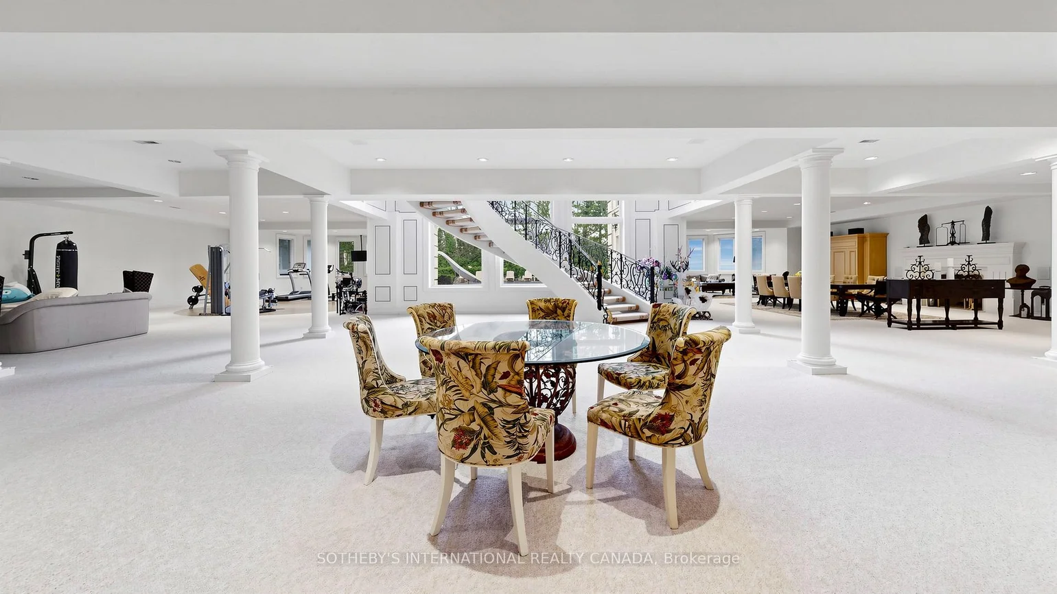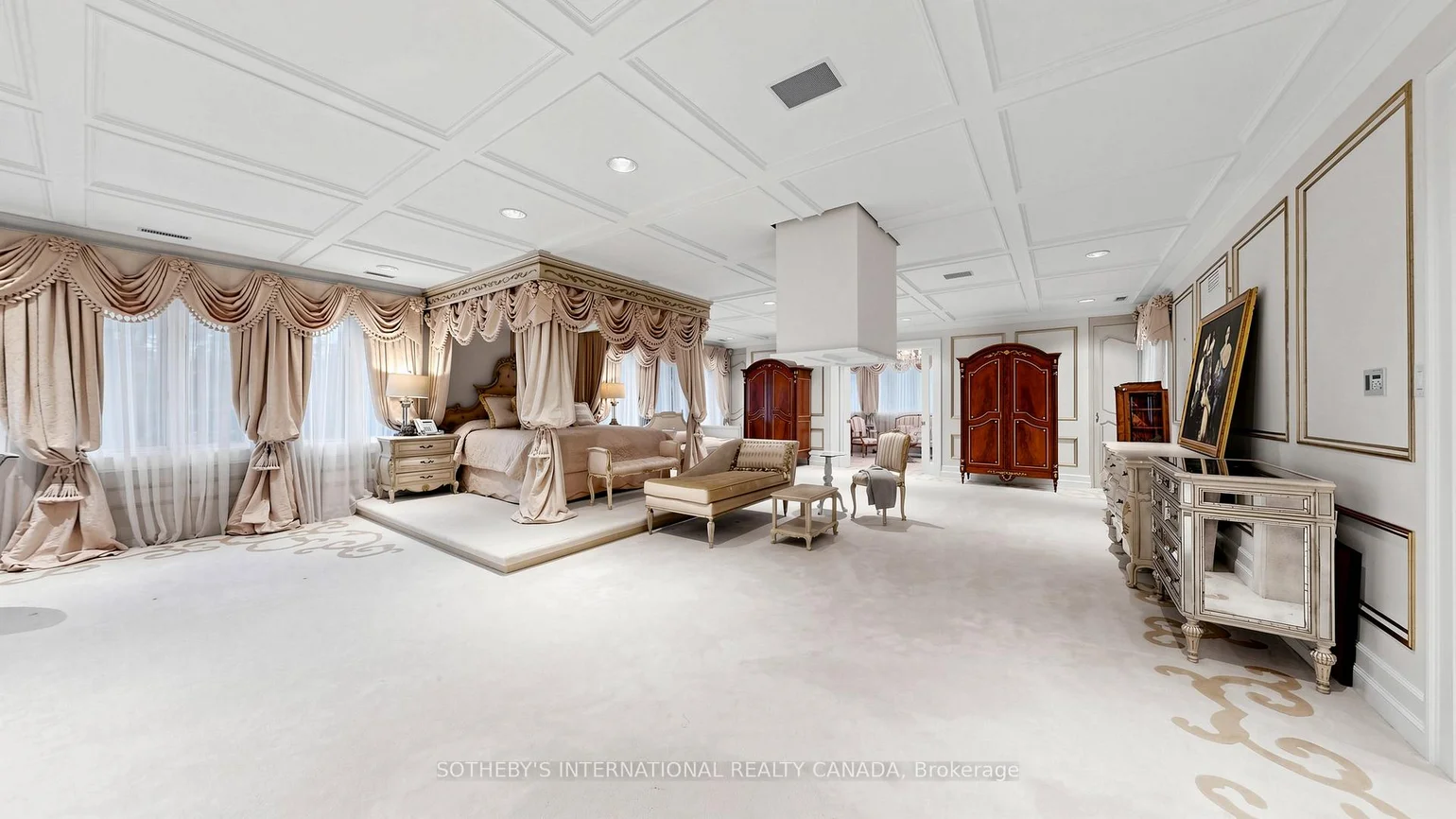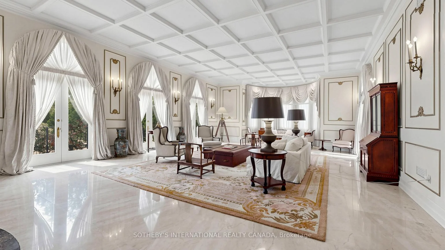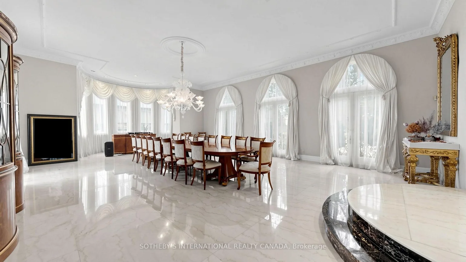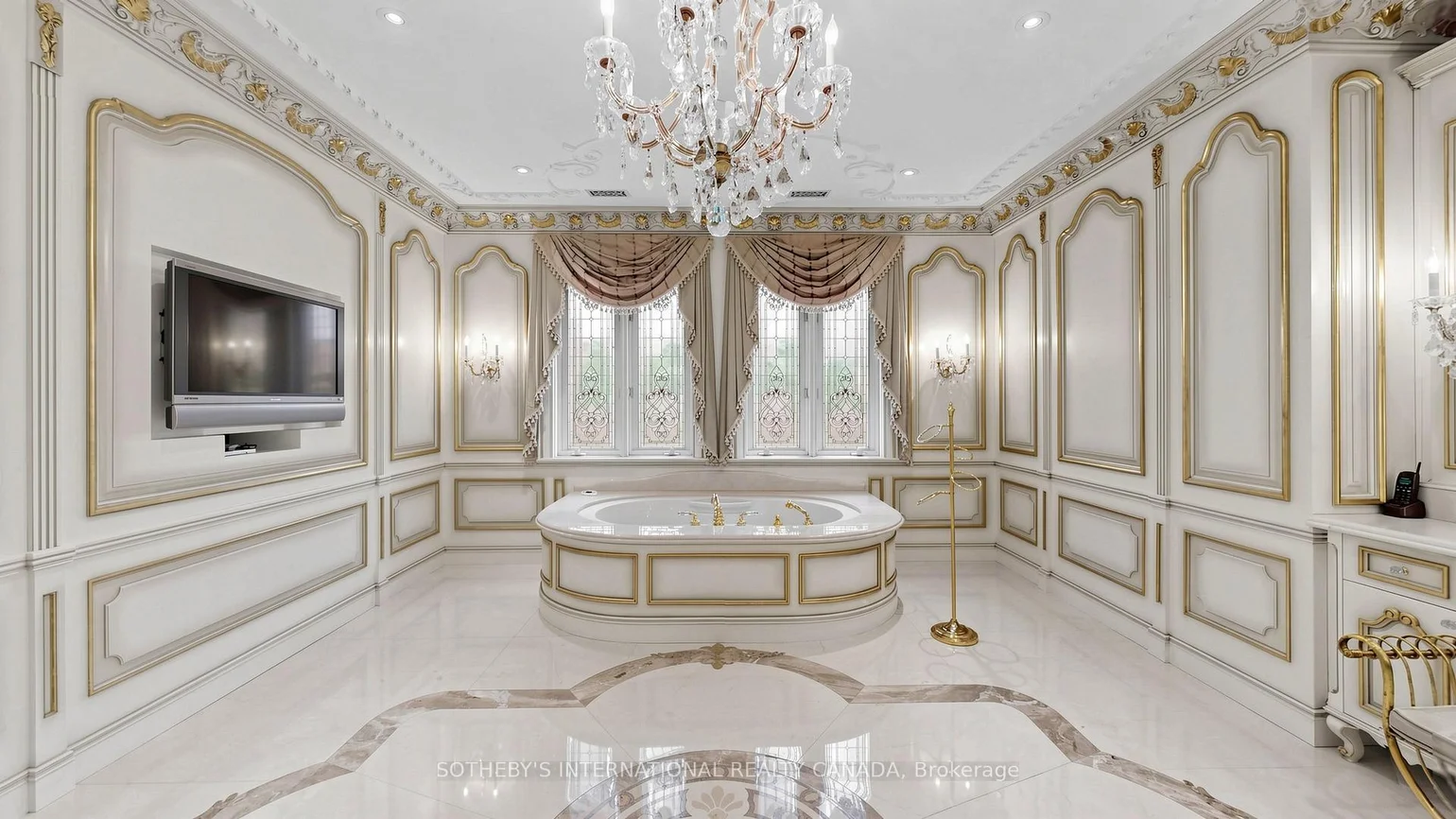 52 Post Rd stands as one of the most distinguished European Neoclassical architectural masterpieces in Bridle Path, Canada's most prestigious residential enclave. Spanning over 25,000 SF, this gated estate is widely regarded as a "Modern Grand Mansion'' of remarkable scale and presence. It seamlessly blends classical symmetry with refined contemporary elegance. Grand, high-arched doorways, intricately patterned marble floors and millwork, sweeping staircases with ornate wrought-iron railings, and monumental architectural proportions establish enduring sophistication and a regal arrival experience. Evoking a Versailles-inspired grandeur, the interiors showcase 14' and 23' soaring ceilings, dramatic stair halls and windows, and dazzling chandeliers that cast a warm, luminous glow throughout. Appx 15,000 SF above grade, incl an unparalleled 300-guest ballroom. Soaring 14' ceiling, 5 +2 generously appointed bedrooms, 13 bathrooms, 3 kitchens. Appx 7,500 SF lower level is thoughtfully designed for comprehensive leisure and entertaining amenities. Lower level features the wellness spa, sauna and hot tub, fitness centre, wine cellar and an extensive billiard room hosting multiple games. A tunnel-connected coach house offers appx 2,500 SF interior, and a 5-car-garage. Sculptural 3-dimensional walls gracefully wrap around a private courtyard, creating a striking focal point. Dramatic 2-storey floor-to-ceiling windows frame serene garden and pool views, cultivating intimate dialogue b/t interior and nature. Resort-inspired backyard featuring an outdoor pool with pool-house, a private tennis court, and a children's playground along expansive lawn and tree-lined tranquil pathway. Set among an extraordinary collection of luxury estates in the Bridle Path, this exceptional location is surrounded by elite public and private schools, renowned Granite Club and Sunnybrook Health Centre. A rare offering defined by prestige, privacy, and elevated lifestyle in the heart of the City.