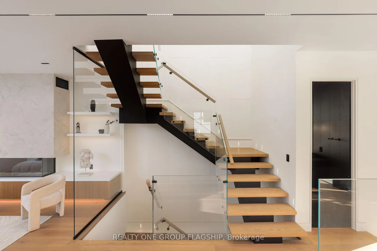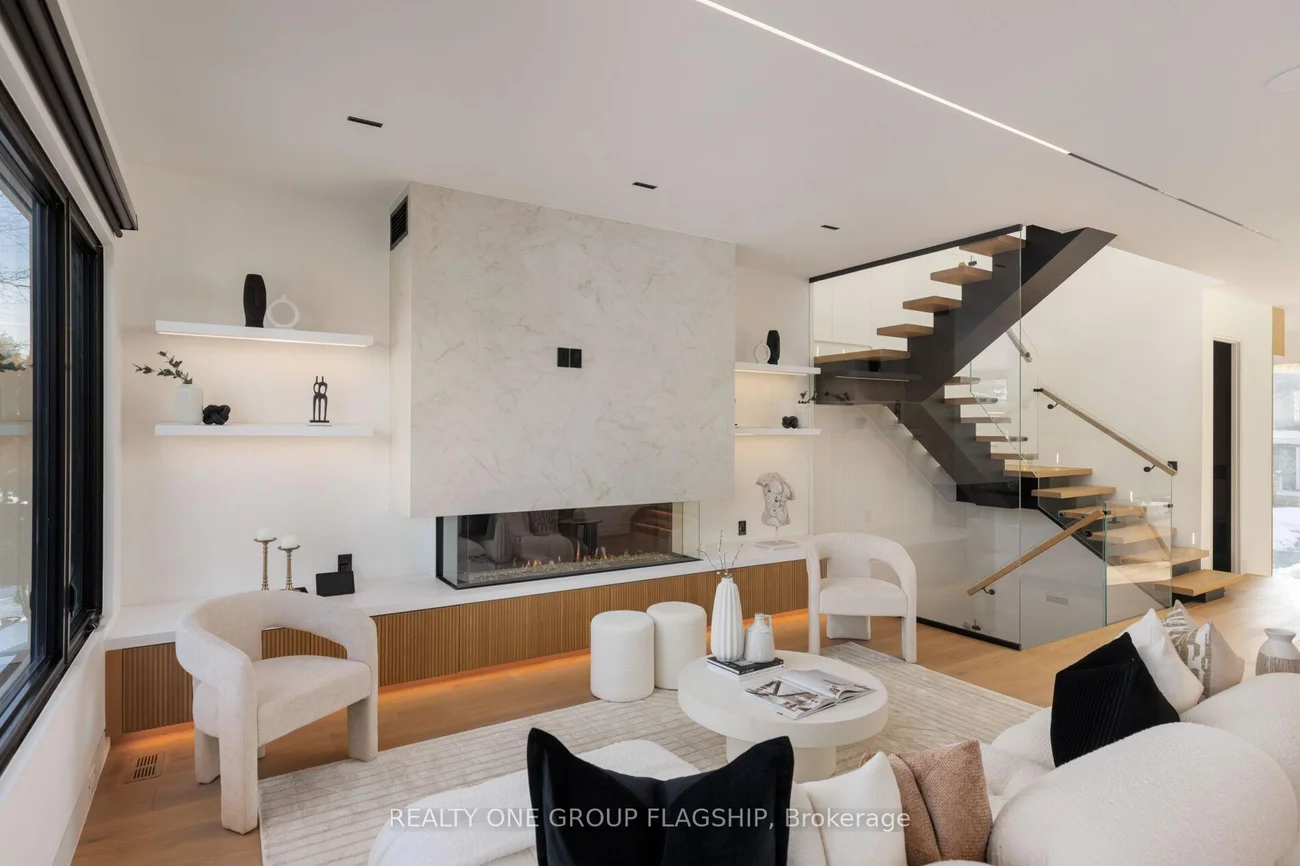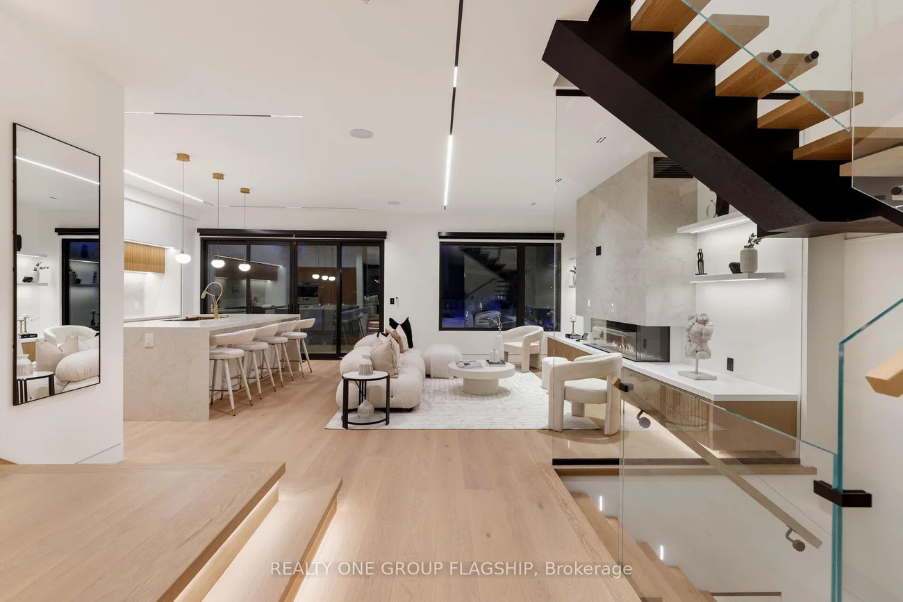 A commanding architectural statement in prestigious Stonegate-Queensway, this newly completed custom residence is thoughtfully crafted by an HCRA-licensed builder and backed by the full Tarion Warranty. Offering approx 3,650 sq ft of curated living space with 4+1 beds & 5+1 baths, the home is defined by architectural clarity, material integrity & refined restraint. A dramatic 14-ft foyer introduces interiors where soaring ceilings, wide-plank white oak floors, bespoke millwork & a fully trimless shadow-reveal design create crisp, uninterrupted lines and a gallery-like atmosphere, enhanced by layered architectural lighting throughout. A sculptural floating mono-beam staircase wrapped in ultra-clear glass rises as a striking focal point, while a porcelain feature wall with a 3-sided fireplace anchors the principal living space with warmth & presence. The chef's kitchen showcases a waterfall porcelain island, handcrafted fluted cabinetry & a professional Sub-Zero & Wolf appliance suite seamlessly integrated into the design. Expansive walls of glass & 9 skylights draw natural light across every level, complementing curated interior illumination and heightening the home's sense of scale and calm. Integrated Control4 automation provides effortless control of lighting, audio, security & motorized window coverings. Upstairs, the primary retreat offers boutique-hotel serenity with custom millwork, a generous walk-in closet & a spa-inspired ensuite finished in rich porcelain & refined fixtures, while each add'l bedroom enjoys ensuite access. The bright walk-up lower level continues the architectural narrative with 10-ft ceilings, a bespoke wet bar, rec lounge, add'l bedroom & full bath. A bold contemporary façade defined by aluminum panel detailing, precision fluted elements & architectural exterior lighting, complemented by professional landscaping, completes this architecturally refined modern residence mins to top schools, waterfront trails, Mimico GO & downtown Toronto.
