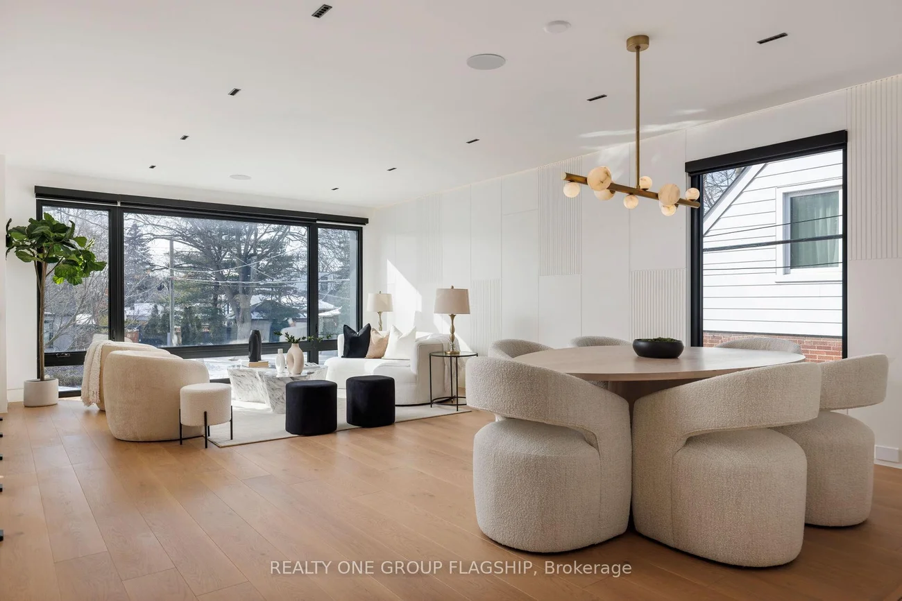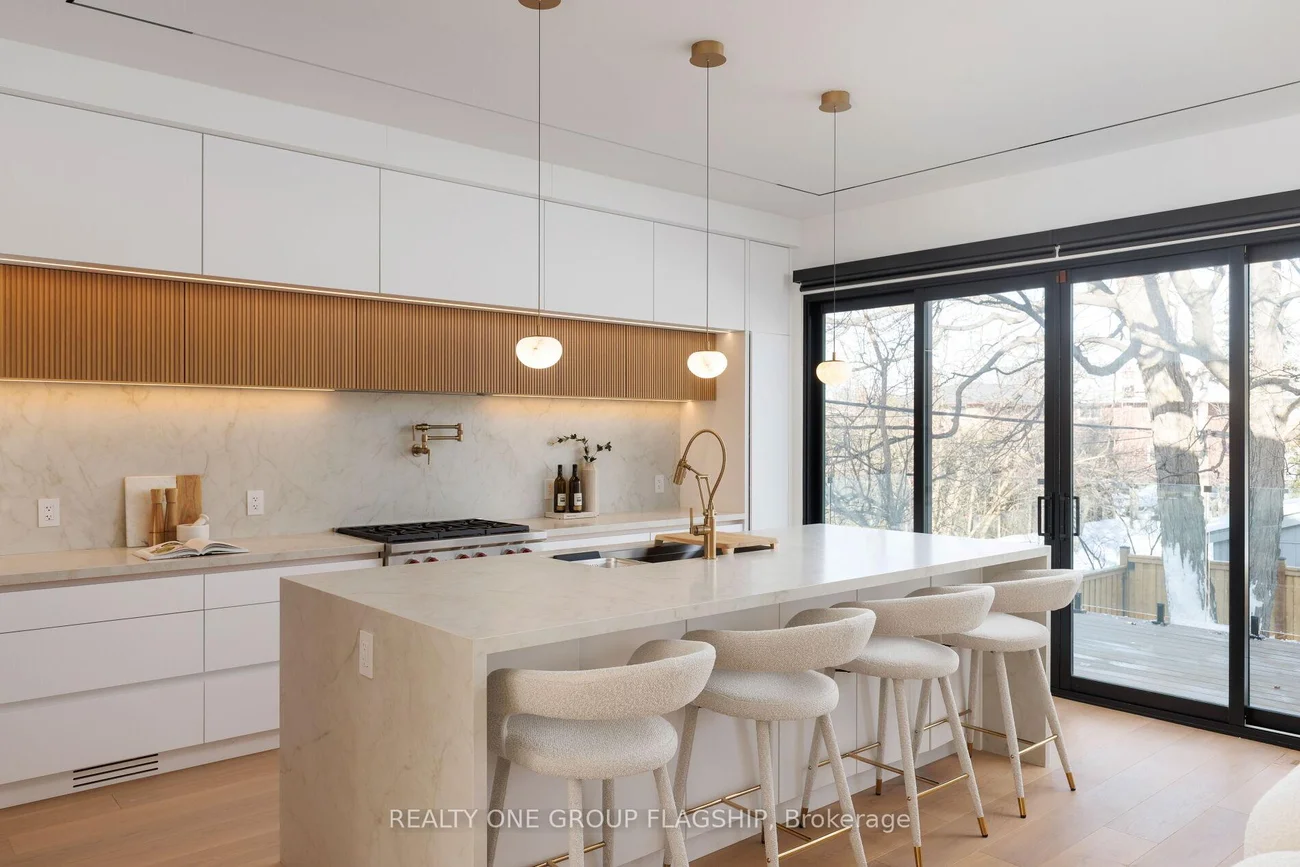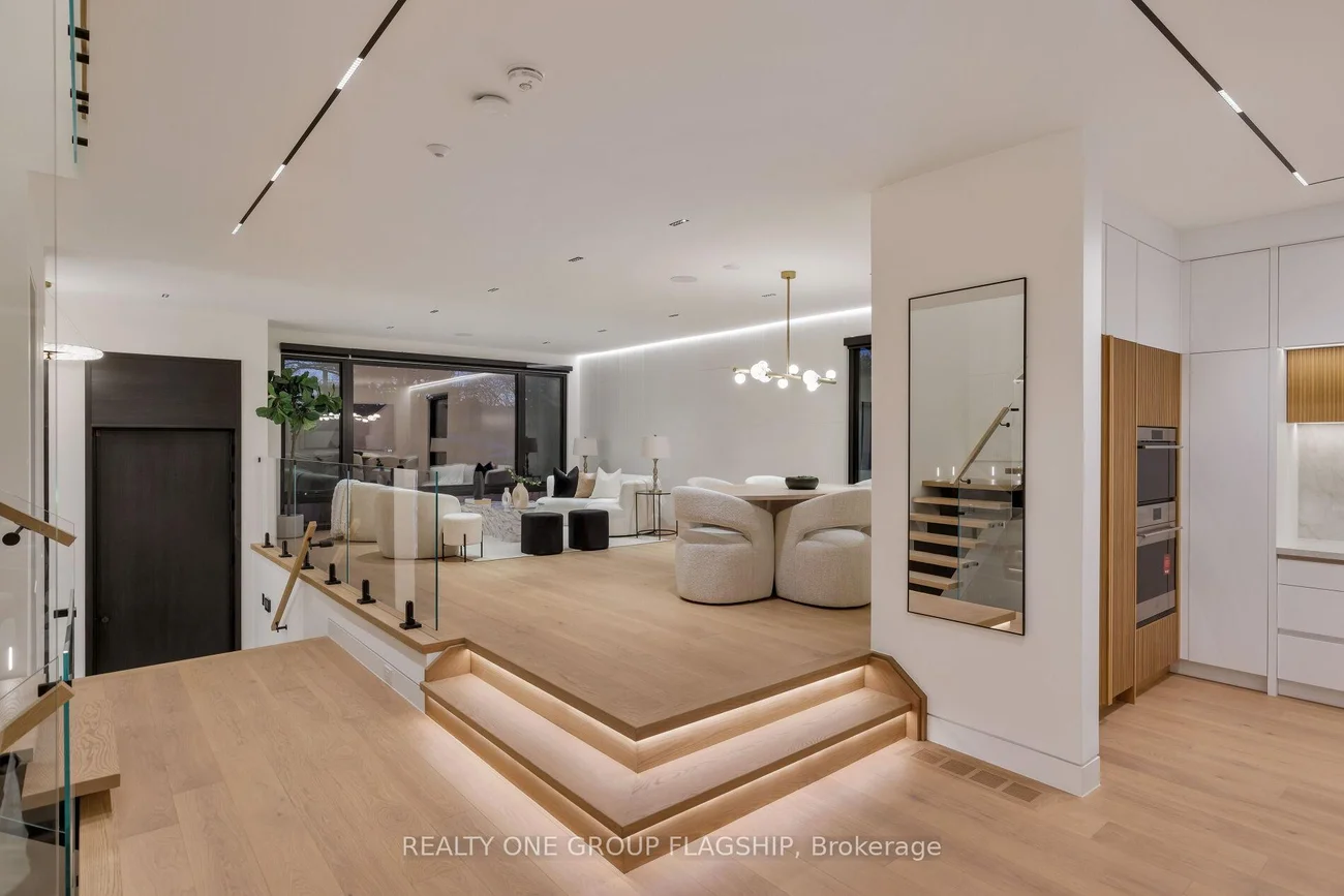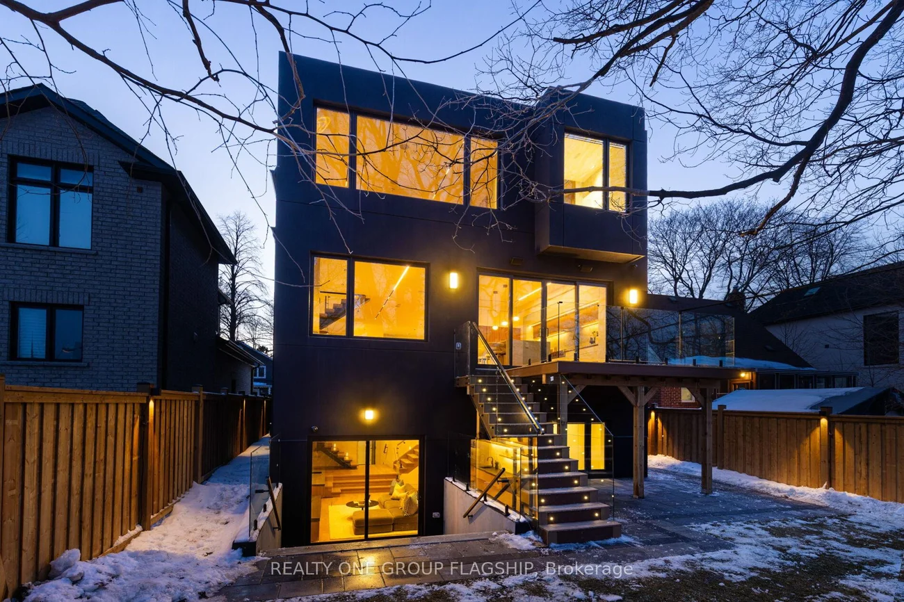 A commanding architectural statement in prestigious Stonegate-Queensway, this newly completed custom residence is thoughtfully crafted by an HCRA-licensed builder and backed by the full Tarion Warranty. Offering approx 3,650 sq ft of curated living space with 4+1 beds & 5+1 baths, the home is defined by architectural clarity, material integrity & refined restraint. A dramatic 14-ft foyer introduces interiors where soaring ceilings, wide-plank white oak floors, bespoke millwork & a fully trimless shadow-reveal design create crisp, uninterrupted lines and a gallery-like atmosphere, enhanced by layered architectural lighting throughout. A sculptural floating mono-beam staircase wrapped in ultra-clear glass rises as a striking focal point, while a porcelain feature wall with a 3-sided fireplace anchors the principal living space with warmth & presence. The chef's kitchen showcases a waterfall porcelain island, handcrafted fluted cabinetry & a professional Sub-Zero & Wolf appliance suite seamlessly integrated into the design. Expansive walls of glass & 9 skylights draw natural light across every level, complementing curated interior illumination and heightening the home's sense of scale and calm. Integrated Control4 automation provides effortless control of lighting, audio, security & motorized window coverings. Upstairs, the primary retreat offers boutique-hotel serenity with custom millwork, a generous walk-in closet & a spa-inspired ensuite finished in rich porcelain & refined fixtures, while each add'l bedroom enjoys ensuite access. The bright walk-up lower level continues the architectural narrative with 10-ft ceilings, a bespoke wet bar, rec lounge, add'l bedroom & full bath. A bold contemporary façade defined by aluminum panel detailing, precision fluted elements & architectural exterior lighting, complemented by professional landscaping, completes this architecturally refined modern residence mins to top schools, waterfront trails, Mimico GO & downtown Toronto.