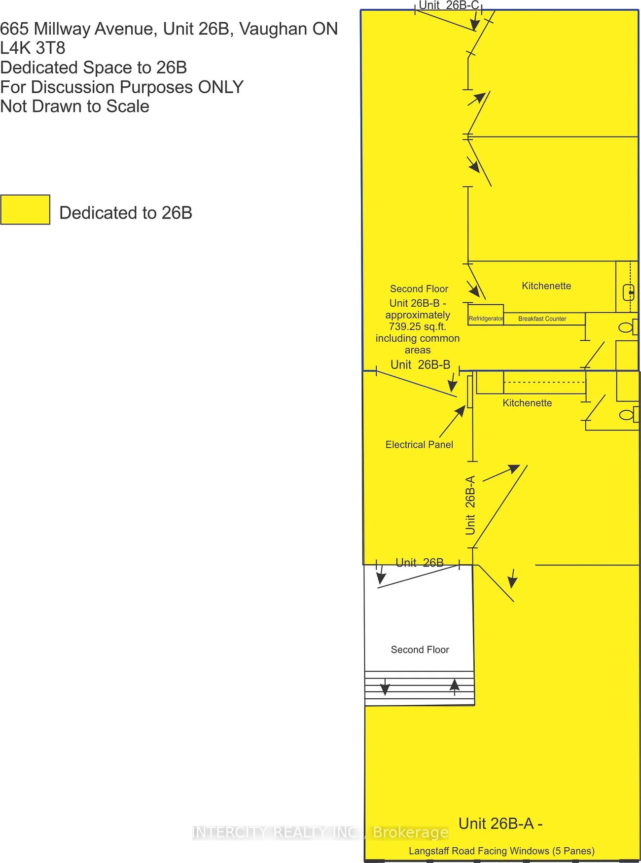 Location, Location, Location! Highly desirable area, completely renovated - brand new second floor high visibility office space. Approximately 1,810 Sq.Ft. on second floor with two 2 piece bathrooms, two kitchens, rent includes utilities (hydro, gas, water) and T.M.I. (property taxes, condominium maintenance fees, building insurance) and garbage removal (no need to arrange for garbage bin), minutes to Hwys 400 & 407, close to Vaughan Metropolitan Centre, 24/7 access, street exposure with large windows - plenty natural light, ample free parking. ** No warehouse/storage and/or use of shipping doors. **EXTRAS** Tenant is responsible for internet, security, telephone, tenant / content / liability insurance. Unit is currently vacant and available for immediate possession.